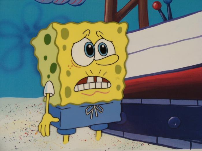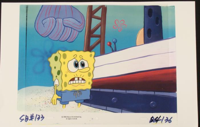 This animation cel and reproduction background are from the Nickelodeon TV show SpongeBob Squarepants. The story takes place under the deep blue sea in Bikini Bottom, where SpongeBob resides. SpongeBob, who is a yellow, porous sponge, is your typical happy-go-lucky character, as he is always cheerful and enjoys making people laugh. Patrick Star, SpongeBob's neighbor who is a starfish, is your average children's show idiot, as he boasts knowing nothing and is often getting himself into ridiculous situations. Between the homes of these two lies the home of the miserable Squidward, a squid, who is known for being grouchy and playing tricks on SpongeBob and Patrick. Both SpongeBob and Squidward work at the Krusty Krab, a fast food business run by the greedy money-loving Mr. Krabs, a crab, the arch rival of the evil, possibly misunderstood, Plankton. Another neighbor, Sandy Cheeks, an athletic squirrel who normally wears an astronaut's space suit, was introduced in "Tea at the Treedome." She spends most of her time inventing and experimenting. SpongeBob is pleading to Plankton to not ruin the beach.Original Printed Background and Animated Cel Overall Size of Background: 11" x 17" Overall Size of the Cel: 10 1/2" x 12 1/2" Very good condition; it has been stored This is an original hand-painted cel set-up used in the production of an episode of "SpongeBob SquarePants." Each one-of-a-kind set-up represents a slight change in position of the characters. When individually photographed and projected in rapid succession, the images appear to move.