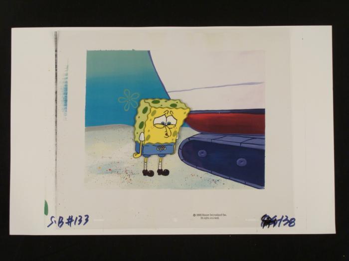 To create production cels, the original animator's drawing is transferred onto an acetate cel (by hand-inking and/or photo copying). The cel is then hand-painted on the reverse side. The background accompanying this set-up is a hand-painted original production background. The printed background is ready to be matted and framed. It is a colored background with a cel and has the animator's notations at the bottom of the background and cel. The background is a reproduction printed background. There is some slight paint fade to SpongeBob's outline.