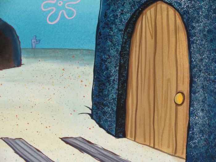 This original hand-painted background from the Nickelodeon TV show SpongeBob Squarepants. The story takes place under the deep blue sea in Bikini Bottom, where SpongeBob resides. SpongeBob, who is a yellow, porous sponge, is your typical happy-go-lucky character, as he is always cheerful and enjoys making people laugh. Patrick Star, SpongeBob's neighbor who is a starfish, is your average children's show idiot, as he boasts knowing nothing and is often getting himself into ridiculous situations. Between the homes of these two lies the home of the miserable Squidward, a squid, who is known for being grouchy and playing tricks on SpongeBob and Patrick. Both SpongeBob and Squidward work at the Krusty Krab, a fast food business run by the greedy money-loving Mr. Krabs, a crab, the arch rival of the evil, possibly misunderstood, Plankton. Another neighbor, Sandy Cheeks, an athletic squirrel who normally wears an astronaut's space suit, was introduced in "Tea at the Treedome." She spends most of her time inventing and experimenting. This is Squidward's house and Patrick's house in the distance.Original Production Background Overall Size of Background: 10 1/4" x 12 3/4" Very good conditionOriginal Production Backgrounds are used in the making of the final version of animated productions. The background establishes the location and the overall good mood of the scenee. Typically, a background layout artist creates a drawing to establish the content of the scene, placement of characters, perspective and camera angle. Based on this drawing, the background artist creates a preliminary painting to confirm all of the scenes details, then the final production background which is used in the filming of the scene. When these backgrounds are individually photographed behind the progression of production cels, and projected at a rapid succession, the images in the foreground appear to move, creating an animated scene. The background is ready to be matted and framed. It is a colored background with the animator's notations at the bottom.