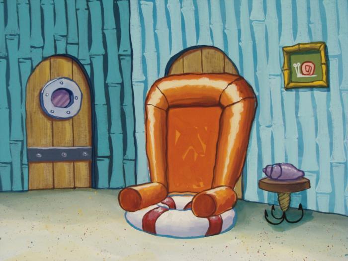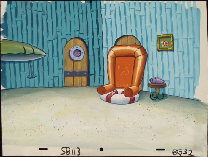 This original hand-painted background from the Nickelodeon TV show SpongeBob Squarepants. The story takes place under the deep blue sea in Bikini Bottom, where SpongeBob resides. SpongeBob, who is a yellow, porous sponge, is your typical happy-go-lucky character, as he is always cheerful and enjoys making people laugh. Patrick Star, SpongeBob's neighbor who is a starfish, is your average children's show idiot, as he boasts knowing nothing and is often getting himself into ridiculous situations. Between the homes of these two lies the home of the miserable Squidward, a squid, who is known for being grouchy and playing tricks on SpongeBob and Patrick. Both SpongeBob and Squidward work at the Krusty Krab, a fast food business run by the greedy money-loving Mr. Krabs, a crab, the arch rival of the evil, possibly misunderstood, Plankton. Another neighbor, Sandy Cheeks, an athletic squirrel who normally wears an astronaut's space suit, was introduced in "Tea at the Treedome." She spends most of her time inventing and experimenting. Pull up a chair and get comfortable.Original Production Background Overall Size of Background: 10 1/2" x 14" Very good condition; it has been storedOriginal Production Backgrounds are used in the making of the final version of animated productions. The background establishes the location and the overall good mood of the scene. Typically, a background layout artist creates a drawing to establish the content of the scene, placement of characters, perspective and camera angle. Based on this drawing, the background artist creates a preliminary painting to confirm all of the scenes details, then the final production background which is used in the filming of the scene. When these backgrounds are individually photographed behind the progression of production cels, and projected at a rapid succession, the images in the foreground appear to move, creating an animated scene. The background is ready to be matted and framed. It is a colored background with the animator's notations at the bottom.