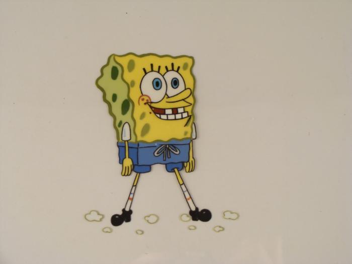 This original animation cel is from the Nickelodeon TV show SpongeBob Squarepants. The story takes place under the deep blue sea in Bikini Bottom, where SpongeBob resides. SpongeBob, who is a yellow, porous sponge, is your typical happy-go-lucky character, as he is always cheerful and enjoys making people laugh. Patrick Star, SpongeBob's Starfish neighbor, boasts knowing nothing and is often getting himself into ridiculous situations. Between the homes of these two lies the home of the miserable Squidward, a squid, who is known for being grouchy and playing tricks on SpongeBob and Patrick. Both SpongeBob and Squidward work at the Krusty Krab, a fast food business run by the greedy money-loving Mr. Krabs, a crab, the arch rival of the evil, possibly misunderstood, Plankton. Another neighbor, Sandy Cheeks, an athletic squirrel who normally wears an astronaut's space suit, was introduced in "Tea at the Treedome." She spends most of her time inventing and experimenting. In this cel SpongeBob is standing on the beach wearing his swim trunks and a big grin. Original Production Animated Cel Overall Size of Cel: 10 1/2" x 12 1/2" Excellent Condition; slight outline wearEach one-of-a-kind set-up represents a slight change in position of the characters. When individually photographed and projected in rapid succession, the images appear to move.