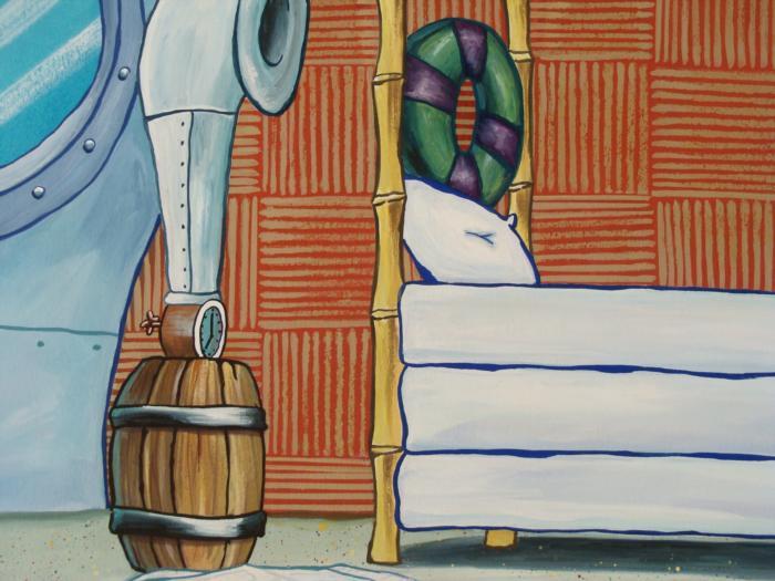 This original hand-painted background from the Nickelodeon TV show SpongeBob Squarepants. The story takes place under the deep blue sea in Bikini Bottom, where SpongeBob resides. SpongeBob, who is a yellow, porous sponge, is your typical happy-go-lucky character, as he is always cheerful and enjoys making people laugh. Patrick Star, SpongeBob's neighbor who is a starfish, is your average children's show idiot, as he boasts knowing nothing and is often getting himself into ridiculous situations. Between the homes of these two lies the home of the miserable Squidward, a squid, who is known for being grouchy and playing tricks on SpongeBob and Patrick. Both SpongeBob and Squidward work at the Krusty Krab, a fast food business run by the greedy money-loving Mr. Krabs, a crab, the arch rival of the evil, possibly misunderstood, Plankton. Another neighbor, Sandy Cheeks, an athletic squirrel who normally wears an astronaut's space suit, was introduced in "Tea at the Treedome." She spends most of her time inventing and experimenting. This is SpongeBob's bedroom.Original Production Background Overall Size of Background: 10 1/2" x 13 3/4" Very good conditionOriginal Production Backgrounds are used in the making of the final version of animated productions. The background establishes the location and the overall good mood of the scenee. Typically, a background layout artist creates a drawing to establish the content of the scene, placement of characters, perspective and camera angle. Based on this drawing, the background artist creates a preliminary painting to confirm all of the scenes details, then the final production background which is used in the filming of the scene. When these backgrounds are individually photographed behind the progression of production cels, and projected at a rapid succession, the images in the foreground appear to move, creating an animated scene. The background is ready to be matted and framed. It is a colored background with the animator's notations at the bottom. The notations have been taped to the bottom of the background