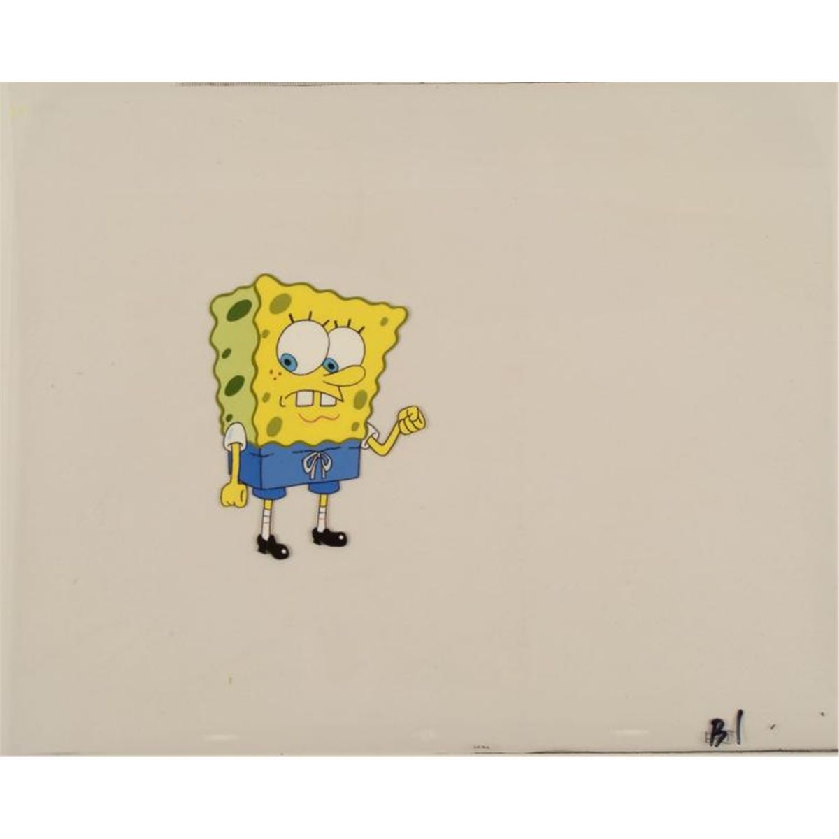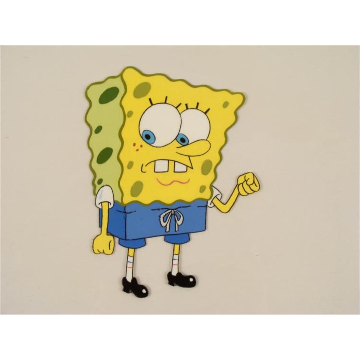 This original animation cel is from the Nickelodeon TV show SpongeBob Squarepants. The story takes place under the deep blue sea in Bikini Bottom, where SpongeBob resides. SpongeBob, who is a yellow, porous sponge, is your typical happy-go-lucky character, as he is always cheerful and enjoys making people laugh. Patrick Star, SpongeBob's neighbor who is a starfish, boasts knowing nothing and is often getting himself into ridiculous situations. Between the homes of these two lies the home of the miserable Squidward, a squid, who is known for being grouchy and playing tricks on SpongeBob and Patrick. Both SpongeBob and Squidward work at the Krusty Krab, a fast food business run by the greedy money-loving Mr. Krabs, a crab, the arch rival of the evil, possibly misunderstood, Plankton. Another neighbor, Sandy Cheeks, an athletic squirrel who normally wears an astronaut's space suit, was introduced in "Tea at the Treedome." She spends most of her time inventing and experimenting. * SpongeBob is pulling something, but mabe pulled a little too hard? * Original Production Animated Cel Overall Size of Cel: 13 1/2" x 16 1/2" Very Good Condition (slight fading to outlines)This is an original hand-painted cel set-up used in the production of an episode of "SpongeBob SquarePants." Each one-of-a-kind set-up represents a slight change in position of the characters. When individually photographed and projected in rapid succession, the images appear to move. * To create production cels, the original animator's drawing is transferred onto an acetate cel (by hand-inking and/or photo copying). The cel is then hand-painted on the reverse side. * Peg holes and animator's notations are at the bottom of the cel. *