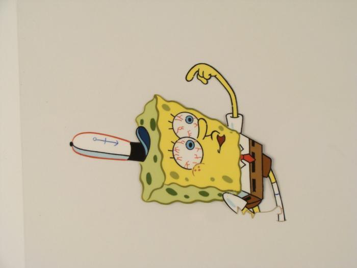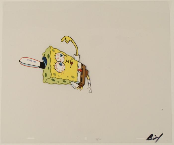 This original animation cel is from the Nickelodeon TV show SpongeBob Squarepants. The story takes place under the deep blue sea in Bikini Bottom, where SpongeBob resides. SpongeBob, who is a yellow, porous sponge, is your typical happy-go-lucky character, as he is always cheerful and enjoys making people laugh. Patrick Star, SpongeBob's neighbor who is a starfish, is your average children's show idiot, as he boasts knowing nothing and is often getting himself into ridiculous situations. Between the homes of these two lies the home of the miserable Squidward, a squid, who is known for being grouchy and playing tricks on SpongeBob and Patrick. Both SpongeBob and Squidward work at the Krusty Krab, a fast food business run by the greedy money-loving Mr. Krabs, a crab, the arch rival of the evil, possibly misunderstood, Plankton. Another neighbor, Sandy Cheeks, an athletic squirrel who normally wears an astronaut's space suit, was introduced in "Tea at the Treedome." She spends most of her time inventing and experimenting. SpongeBob have bloodshot eyes.Original Production Animated Cel Overall Size of Cel: 10 1/2" x 12 1/2" Very Good ConditionThis is an original hand-painted cel set-up used in the production of an episode of "SpongeBob SquarePants." Each one-of-a-kind set-up represents a slight change in position of the characters. When individually photographed and projected in rapid succession, the images appear to move.