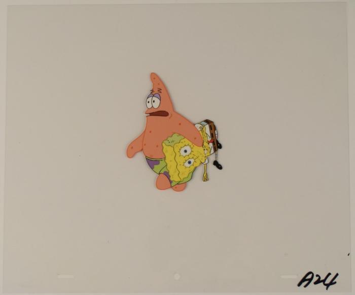 This original animation cel is from the Nickelodeon TV show SpongeBob Squarepants. The story takes place under the deep blue sea in Bikini Bottom, where SpongeBob resides. SpongeBob, who is a yellow, porous sponge, is your typical happy-go-lucky character, as he is always cheerful and enjoys making people laugh. Patrick Star, SpongeBob's Starfish neighbor, boasts knowing nothing and is often getting himself into ridiculous situations. Between the homes of these two lies the home of the miserable Squidward, a squid, who is known for being grouchy and playing tricks on SpongeBob and Patrick. Both SpongeBob and Squidward work at the Krusty Krab, a fast food business run by the greedy money-loving Mr. Krabs, a crab, the arch rival of the evil, possibly misunderstood, Plankton. Another neighbor, Sandy Cheeks, an athletic squirrel who normally wears an astronaut's space suit, was introduced in "Tea at the Treedome." She spends most of her time inventing and experimenting. In this cel SpongeBob is being carried along by his friend Patrick. Original Production Animated Cel Overall Size of Cel: 10 1/2" x 12 1/2" Excellent Condition; slight outline wearEach one-of-a-kind set-up represents a slight change in position of the characters. When individually photographed and projected in rapid succession, the images appear to move.
