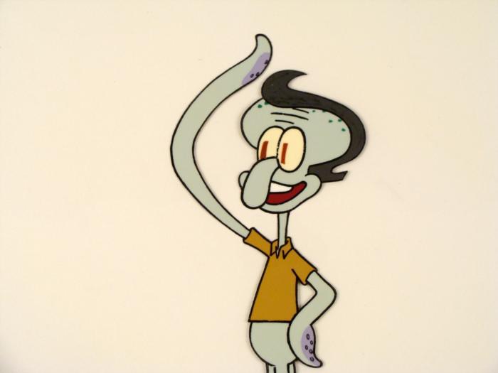 This original animation cel is from the Nickelodeon TV show SpongeBob Squarepants. The story takes place under the deep blue sea in Bikini Bottom, where SpongeBob resides. SpongeBob, who is a yellow, porous sponge, is your typical happy-go-lucky character, as he is always cheerful and enjoys making people laugh. Patrick Star, SpongeBob's neighbor who is a starfish, is your average children's show idiot, as he boasts knowing nothing and is often getting himself into ridiculous situations. Between the homes of these two lies the home of the miserable Squidward, a squid, who is known for being grouchy and playing tricks on SpongeBob and Patrick. Both SpongeBob and Squidward work at the Krusty Krab, a fast food business run by the greedy money-loving Mr. Krabs, a crab, the arch rival of the evil, possibly misunderstood, Plankton. Another neighbor, Sandy Cheeks, an athletic squirrel who normally wears an astronaut's space suit, was introduced in "Tea at the Treedome." She spends most of her time inventing and experimenting. Squidward is loving his new hair.Original Production Animated Cel Overall Size of Cel: 10 1/2" x 12 1/2" Very Good ConditionThis is an original hand-painted cel set-up used in the production of an episode of "SpongeBob SquarePants." Each one-of-a-kind set-up represents a slight change in position of the characters. When individually photographed and projected in rapid succession, the images appear to move.