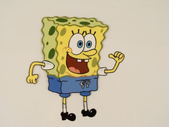 This original animation cel is from the Nickelodeon TV show SpongeBob Squarepants. The story takes place under the deep blue sea in Bikini Bottom, where SpongeBob resides. SpongeBob, who is a yellow, porous sponge, is your typical happy-go-lucky character, as he is always cheerful and enjoys making people laugh. Patrick Star, SpongeBob's neighbor who is a starfish, is your average children's show idiot, as he boasts knowing nothing and is often getting himself into ridiculous situations. Between the homes of these two lies the home of the miserable Squidward, a squid, who is known for being grouchy and playing tricks on SpongeBob and Patrick. Both SpongeBob and Squidward work at the Krusty Krab, a fast food business run by the greedy money-loving Mr. Krabs, a crab, the arch rival of the evil, possibly misunderstood, Plankton. Another neighbor, Sandy Cheeks, an athletic squirrel who normally wears an astronaut's space suit, was introduced in "Tea at the Treedome." She spends most of her time inventing and experimenting. SpongeBob is pointing at himself.Original Production Animated Cel Overall Size of Cel: 10 1/2" x 12 1/2" Very Good ConditionThis is an original hand-painted cel set-up used in the production of an episode of "SpongeBob SquarePants." Each one-of-a-kind set-up represents a slight change in position of the characters. When individually photographed and projected in rapid succession, the images appear to move.