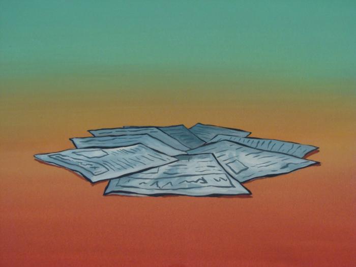 This original hand-painted background and animation cel are from the Nickelodeon TV show SpongeBob Squarepants. The story takes place under the deep blue sea in Bikini Bottom, where SpongeBob resides. SpongeBob, who is a yellow, porous sponge, is your typical happy-go-lucky character, as he is always cheerful and enjoys making people laugh. Patrick Star, SpongeBob's neighbor who is a starfish, is your average children's show idiot, as he boasts knowing nothing and is often getting himself into ridiculous situations. Between the homes of these two lies the home of the miserable Squidward, a squid, who is known for being grouchy and playing tricks on SpongeBob and Patrick. Both SpongeBob and Squidward work at the Krusty Krab, a fast food business run by the greedy money-loving Mr. Krabs, a crab, the arch rival of the evil, possibly misunderstood, Plankton. Another neighbor, Sandy Cheeks, an athletic squirrel who normally wears an astronaut's space suit, was introduced in "Tea at the Treedome." She spends most of her time inventing and experimenting. There is a newspaper on the ground.Original Production Background and Animated Cel Overall Size of Background: 10 1/2" x 14" Overall Size of the Cel: 10 1/2" x 12 1/2" Very good condition This is an original hand-painted cel set-up used in the production of an episode of "SpongeBob SquarePants." Each one-of-a-kind set-up represents a slight change in position of the characters. When individually photographed and projected in rapid succession, the images appear to move.