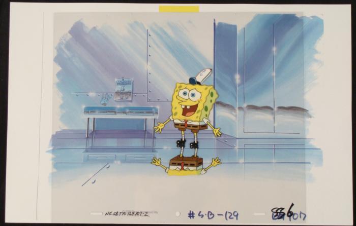 To create production cels, the original animator's drawing is transferred onto an acetate cel (by hand-inking and/or photo copying). The cel is then hand-painted on the reverse side. The printed background is ready to be matted and framed. It is a colored background with a cel and has the animator's notations at the bottom of the background and the cel. The cel has multiple layers; first is SpongeBob's shadow and the second cel is of SpongeBob. The background is a printed reproduction background.