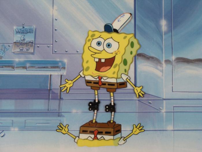 This animation cel and reproduction background are from the Nickelodeon TV show SpongeBob Squarepants. The story takes place under the deep blue sea in Bikini Bottom, where SpongeBob resides. SpongeBob, who is a yellow, porous sponge, is your typical happy-go-lucky character, as he is always cheerful and enjoys making people laugh. Patrick Star, SpongeBob's neighbor who is a starfish, is your average children's show idiot, as he boasts knowing nothing and is often getting himself into ridiculous situations. Between the homes of these two lies the home of the miserable Squidward, a squid, who is known for being grouchy and playing tricks on SpongeBob and Patrick. Both SpongeBob and Squidward work at the Krusty Krab, a fast food business run by the greedy money-loving Mr. Krabs, a crab, the arch rival of the evil, possibly misunderstood, Plankton. Another neighbor, Sandy Cheeks, an athletic squirrel who normally wears an astronaut's space suit, was introduced in "Tea at the Treedome." She spends most of her time inventing and experimenting. The whole room is chrome.Original Printed Background and Animated Cel Overall Size of Background: 10 1/2" x 17" Overall Size of the Cel: 10 1/2" x 12 1/2" Very good condition This is an original hand-painted cel set-up used in the production of an episode of "SpongeBob SquarePants." Each one-of-a-kind set-up represents a slight change in position of the characters. When individually photographed and projected in rapid succession, the images appear to move.
