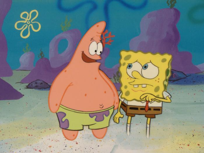 This animation cel and reproduction background are from the Nickelodeon TV show SpongeBob Squarepants. The story takes place under the deep blue sea in Bikini Bottom, where SpongeBob resides. SpongeBob, who is a yellow, porous sponge, is your typical happy-go-lucky character, as he is always cheerful and enjoys making people laugh. Patrick Star, SpongeBob's neighbor who is a starfish, is your average children's show idiot, as he boasts knowing nothing and is often getting himself into ridiculous situations. Between the homes of these two lies the home of the miserable Squidward, a squid, who is known for being grouchy and playing tricks on SpongeBob and Patrick. Both SpongeBob and Squidward work at the Krusty Krab, a fast food business run by the greedy money-loving Mr. Krabs, a crab, the arch rival of the evil, possibly misunderstood, Plankton. Another neighbor, Sandy Cheeks, an athletic squirrel who normally wears an astronaut's space suit, was introduced in "Tea at the Treedome." She spends most of her time inventing and experimenting. SpongeBob looks confused.Original Printed Background and Animated Cel Overall Size of Background: 10 1/2" x 17" Overall Size of the Cel: 10 1/2" x 12 1/2" Very good condition This is an original hand-painted cel set-up used in the production of an episode of "SpongeBob SquarePants." Each one-of-a-kind set-up represents a slight change in position of the characters. When individually photographed and projected in rapid succession, the images appear to move.