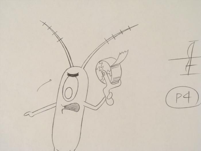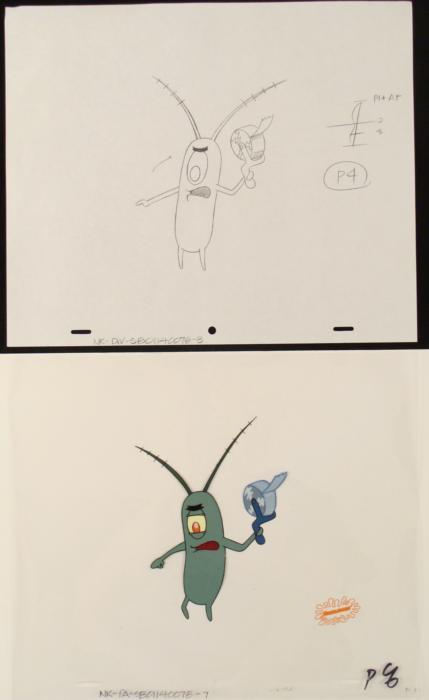 This original animation cel is from the Nickelodeon TV show SpongeBob Squarepants. The story takes place under the deep blue sea in Bikini Bottom, where SpongeBob resides. SpongeBob, who is a yellow, porous sponge, is your typical happy-go-lucky character, as he is always cheerful and enjoys making people laugh. Patrick Star, SpongeBob's neighbor who is a starfish, is your average children's show idiot, as he boasts knowing nothing and is often getting himself into ridiculous situations. Between the homes of these two lies the home of the miserable Squidward, a squid, who is known for being grouchy and playing tricks on SpongeBob and Patrick. Both SpongeBob and Squidward work at the Krusty Krab, a fast food business run by the greedy money-loving Mr. Krabs, a crab, the arch rival of the evil, possibly misunderstood, Plankton. Another neighbor, Sandy Cheeks, an athletic squirrel who normally wears an astronaut's space suit, was introduced in "Tea at the Treedome." She spends most of her time inventing and experimenting. Shown here is Plankton holding a roll of tape.Original Production Animated Cel and Drawing Original "rough" animation drawing, in black with notations in blackOverall Size of Drawing: 10 1/2" x 12 1/2" Overall Size of Cel: 10 1/2" x 12 1/2" Very Good ConditionThis is an original hand-painted cel set-up used in the production of an episode of "SpongeBob SquarePants." Each one-of-a-kind set-up represents a slight change in position of the characters. When individually photographed and projected in rapid succession, the images appear to move.