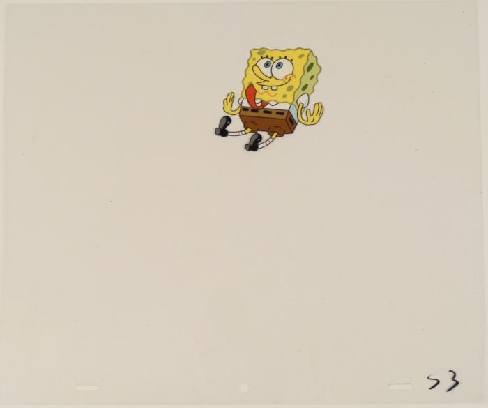 This original animation cel is from the Nickelodeon TV show SpongeBob Squarepants. The story takes place under the deep blue sea in Bikini Bottom, where SpongeBob resides. SpongeBob, who is a yellow, porous sponge, is your typical happy-go-lucky character, as he is always cheerful and enjoys making people laugh. Patrick Star, SpongeBob's Starfish neighbor, boasts knowing nothing and is often getting himself into ridiculous situations. Between the homes of these two lies the home of the miserable Squidward, a squid, who is known for being grouchy and playing tricks on SpongeBob and Patrick. Both SpongeBob and Squidward work at the Krusty Krab, a fast food business run by the greedy money-loving Mr. Krabs, a crab, the arch rival of the evil, possibly misunderstood, Plankton. Another neighbor, Sandy Cheeks, an athletic squirrel who normally wears an astronaut's space suit, was introduced in "Tea at the Treedome." She spends most of her time inventing and experimenting. In this cel a SpongeBob is falling through the air--but he doesn't look too worried, though.. Original Production Animated Cel Overall Size of Cel: 10 1/2" x 12 1/2" Excellent Condition; minor outline wearThis is an original hand-painted cel set-up used in the production of an episode of "SpongeBob SquarePants." Each one-of-a-kind set-up represents a slight change in position of the characters. When individually photographed and projected in rapid succession, the images appear to move.