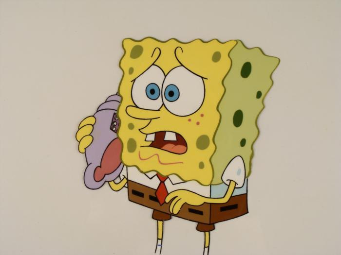 This original animation cel is from the Nickelodeon TV show SpongeBob Squarepants. The story takes place under the deep blue sea in Bikini Bottom, where SpongeBob resides. SpongeBob, who is a yellow, porous sponge, is your typical happy-go-lucky character, as he is always cheerful and enjoys making people laugh. Patrick Star, SpongeBob's Starfish neighbor, boasts knowing nothing and is often getting himself into ridiculous situations. Between the homes of these two lies the home of the miserable Squidward, a squid, who is known for being grouchy and playing tricks on SpongeBob and Patrick. Both SpongeBob and Squidward work at the Krusty Krab, a fast food business run by the greedy money-loving Mr. Krabs, a crab, the arch rival of the evil, possibly misunderstood, Plankton. Another neighbor, Sandy Cheeks, an athletic squirrel who normally wears an astronaut's space suit, was introduced in "Tea at the Treedome." She spends most of her time inventing and experimenting. In this cel SpongeBob is talking on the phone, looking quite frantic. Original Production Animated Cel Overall Size of Cel: 10 1/2" x 12 1/2" Excellent Condition; slight outline wearEach one-of-a-kind set-up represents a slight change in position of the characters. When individually photographed and projected in rapid succession, the images appear to move.