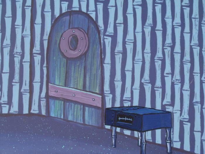 This original hand-painted background and animation cel are from the Nickelodeon TV show SpongeBob Squarepants. The story takes place under the deep blue sea in Bikini Bottom, where SpongeBob resides. SpongeBob, who is a yellow, porous sponge, is your typical happy-go-lucky character, as he is always cheerful and enjoys making people laugh. Patrick Star, SpongeBob's neighbor who is a starfish, is your average children's show idiot, as he boasts knowing nothing and is often getting himself into ridiculous situations. Between the homes of these two lies the home of the miserable Squidward, a squid, who is known for being grouchy and playing tricks on SpongeBob and Patrick. Both SpongeBob and Squidward work at the Krusty Krab, a fast food business run by the greedy money-loving Mr. Krabs, a crab, the arch rival of the evil, possibly misunderstood, Plankton. Another neighbor, Sandy Cheeks, an athletic squirrel who normally wears an astronaut's space suit, was introduced in "Tea at the Treedome." She spends most of her time inventing and experimenting. Why is there no furniture in the house?Original Production Background and Animated Cel Overall Size of Background: 10 1/2" x 13 1/4" Overall Size of the Cel: 10 1/2" x 12 1/2" Very good condition This is an original hand-painted cel set-up used in the production of an episode of "SpongeBob SquarePants." Each one-of-a-kind set-up represents a slight change in position of the characters. When individually photographed and projected in rapid succession, the images appear to move.