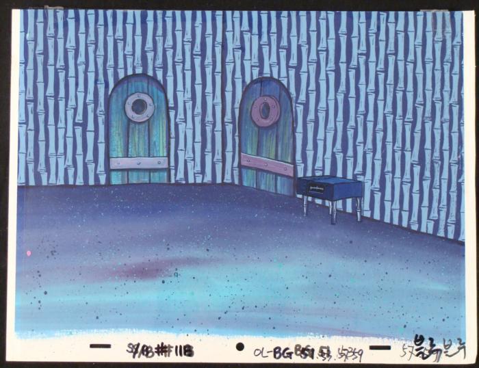 This original hand-painted background and animation cel are from the Nickelodeon TV show SpongeBob Squarepants. The story takes place under the deep blue sea in Bikini Bottom, where SpongeBob resides. SpongeBob, who is a yellow, porous sponge, is your typical happy-go-lucky character, as he is always cheerful and enjoys making people laugh. Patrick Star, SpongeBob's neighbor who is a starfish, is your average children's show idiot, as he boasts knowing nothing and is often getting himself into ridiculous situations. Between the homes of these two lies the home of the miserable Squidward, a squid, who is known for being grouchy and playing tricks on SpongeBob and Patrick. Both SpongeBob and Squidward work at the Krusty Krab, a fast food business run by the greedy money-loving Mr. Krabs, a crab, the arch rival of the evil, possibly misunderstood, Plankton. Another neighbor, Sandy Cheeks, an athletic squirrel who normally wears an astronaut's space suit, was introduced in "Tea at the Treedome." She spends most of her time inventing and experimenting. Why is there no furniture in the house?Original Production Background and Animated Cel Overall Size of Background: 10 1/2" x 13 1/4" Overall Size of the Cel: 10 1/2" x 12 1/2" Very good condition This is an original hand-painted cel set-up used in the production of an episode of "SpongeBob SquarePants." Each one-of-a-kind set-up represents a slight change in position of the characters. When individually photographed and projected in rapid succession, the images appear to move.