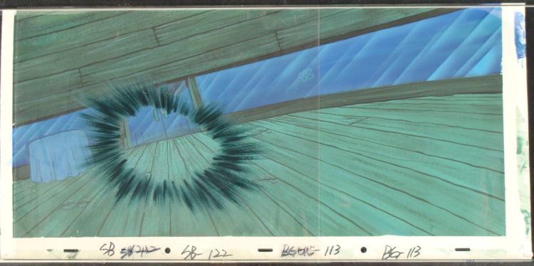 This original hand-painted background and animation cel is from the Nickelodeon TV show SpongeBob Squarepants. The story takes place under the deep blue sea in Bikini Bottom, where SpongeBob resides. SpongeBob, who is a yellow, porous sponge, is your typical happy-go-lucky character, as he is always cheerful and enjoys making people laugh. Patrick Star, SpongeBob's neighbor who is a starfish, is your average children's show idiot, as he boasts knowing nothing and is often getting himself into ridiculous situations. Between the homes of these two lies the home of the miserable Squidward, a squid, who is known for being grouchy and playing tricks on SpongeBob and Patrick. Both SpongeBob and Squidward work at the Krusty Krab, a fast food business run by the greedy money-loving Mr. Krabs, a crab, the arch rival of the evil, possibly misunderstood, Plankton. Another neighbor, Sandy Cheeks, an athletic squirrel who normally wears an astronaut's space suit, was introduced in "Tea at the Treedome." She spends most of her time inventing and experimenting. In this background, their a some sort of glow surrounding a door way in a restaurant. * Original Production Background and Animated Cel Overall Size of Background: 10 1/2" x 21 1/2" Overall Size of the Cels: 10 1/2" x 22" Very good condition; it has been stored rolled This is an original hand-painted cel set-up used in the production of an episode of "SpongeBob SquarePants." Each one-of-a-kind set-up represents a slight change in position of the characters. When individually photographed and projected in rapid succession, the images appear to move. * To create production cels, the original animator's drawing is transferred onto an acetate cel (by hand-inking and/or photo copying). The cel is then hand-painted on the reverse side. The background accompanying this set-up is a hand-painted original production background. * The background is ready to be matted and framed. It is a colored background with a cel and has the animator's notations at the bottom of the background. The cel is multilayered: the first cell is the glow burst and the second cel is the windows and door reflection. Each cel has a protective cel layer over them.