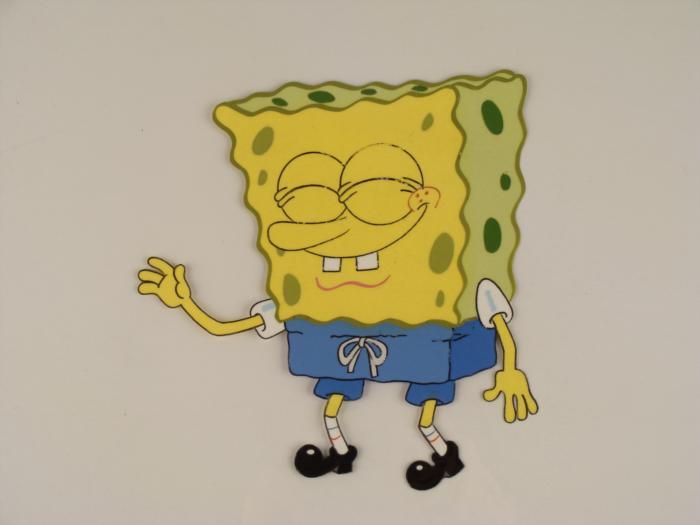 This original animation cel is from the Nickelodeon TV show SpongeBob Squarepants. The story takes place under the deep blue sea in Bikini Bottom, where SpongeBob resides. SpongeBob, who is a yellow, porous sponge, is your typical happy-go-lucky character, as he is always cheerful and enjoys making people laugh. Patrick Star, SpongeBob's Starfish neighbor, boasts knowing nothing and is often getting himself into ridiculous situations. Between the homes of these two lies the home of the miserable Squidward, a squid, who is known for being grouchy and playing tricks on SpongeBob and Patrick. Both SpongeBob and Squidward work at the Krusty Krab, a fast food business run by the greedy money-loving Mr. Krabs, a crab, the arch rival of the evil, possibly misunderstood, Plankton. Another neighbor, Sandy Cheeks, an athletic squirrel who normally wears an astronaut's space suit, was introduced in "Tea at the Treedome." She spends most of her time inventing and experimenting. This cel is larger than average. In it, SpongeBob looks pleased with himself. Original Production Animated Cel Overall Size of Cel: 13 1/2" x 16 1/2" Excellent Condition; slight outline wearEach one-of-a-kind set-up represents a slight change in position of the characters. When individually photographed and projected in rapid succession, the images appear to move.