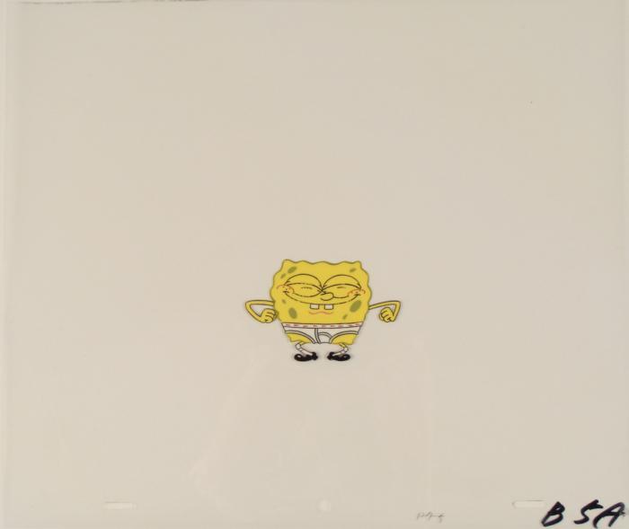 This original animation cel is from the Nickelodeon TV show SpongeBob Squarepants. The story takes place under the deep blue sea in Bikini Bottom, where SpongeBob resides. SpongeBob, who is a yellow, porous sponge, is your typical happy-go-lucky character, as he is always cheerful and enjoys making people laugh. Patrick Star, SpongeBob's Starfish neighbor, boasts knowing nothing and is often getting himself into ridiculous situations. Between the homes of these two lies the home of the miserable Squidward, a squid, who is known for being grouchy and playing tricks on SpongeBob and Patrick. Both SpongeBob and Squidward work at the Krusty Krab, a fast food business run by the greedy money-loving Mr. Krabs, a crab, the arch rival of the evil, possibly misunderstood, Plankton. Another neighbor, Sandy Cheeks, an athletic squirrel who normally wears an astronaut's space suit, was introduced in "Tea at the Treedome." She spends most of her time inventing and experimenting. In this cel a SpongeBob is in his underpants, and he's puffing up like a puffer fish! Original Production Animated Cel Overall Size of Cel: 10 1/2" x 12 1/2" Excellent Condition; minor outline wearThis is an original hand-painted cel set-up used in the production of an episode of "SpongeBob SquarePants." Each one-of-a-kind set-up represents a slight change in position of the characters. When individually photographed and projected in rapid succession, the images appear to move.
