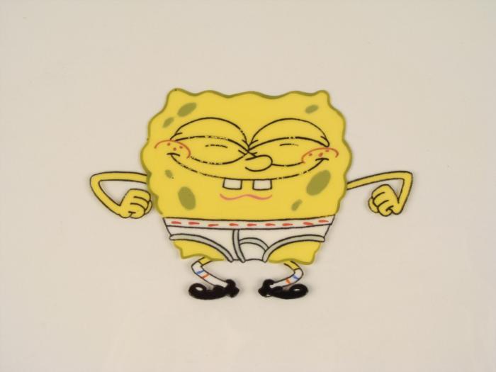 This original animation cel is from the Nickelodeon TV show SpongeBob Squarepants. The story takes place under the deep blue sea in Bikini Bottom, where SpongeBob resides. SpongeBob, who is a yellow, porous sponge, is your typical happy-go-lucky character, as he is always cheerful and enjoys making people laugh. Patrick Star, SpongeBob's Starfish neighbor, boasts knowing nothing and is often getting himself into ridiculous situations. Between the homes of these two lies the home of the miserable Squidward, a squid, who is known for being grouchy and playing tricks on SpongeBob and Patrick. Both SpongeBob and Squidward work at the Krusty Krab, a fast food business run by the greedy money-loving Mr. Krabs, a crab, the arch rival of the evil, possibly misunderstood, Plankton. Another neighbor, Sandy Cheeks, an athletic squirrel who normally wears an astronaut's space suit, was introduced in "Tea at the Treedome." She spends most of her time inventing and experimenting. In this cel a SpongeBob is in his underpants, and he's puffing up like a puffer fish! Original Production Animated Cel Overall Size of Cel: 10 1/2" x 12 1/2" Excellent Condition; minor outline wearThis is an original hand-painted cel set-up used in the production of an episode of "SpongeBob SquarePants." Each one-of-a-kind set-up represents a slight change in position of the characters. When individually photographed and projected in rapid succession, the images appear to move.