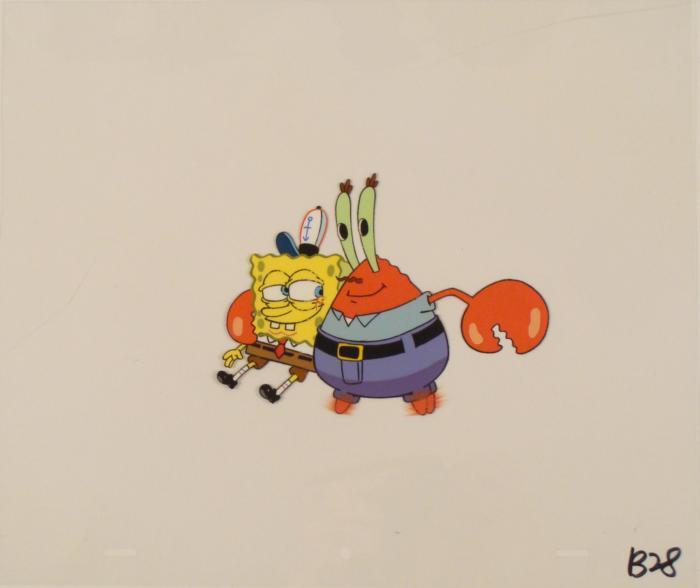 This original animation cel is from the Nickelodeon TV show SpongeBob Squarepants. The story takes place under the deep blue sea in Bikini Bottom, where SpongeBob resides. SpongeBob, who is a yellow, porous sponge, is your typical happy-go-lucky character, as he is always cheerful and enjoys making people laugh. Patrick Star, SpongeBob's neighbor who is a starfish, is your average children's show idiot, as he boasts knowing nothing and is often getting himself into ridiculous situations. Between the homes of these two lies the home of the miserable Squidward, a squid, who is known for being grouchy and playing tricks on SpongeBob and Patrick. Both SpongeBob and Squidward work at the Krusty Krab, a fast food business run by the greedy money-loving Mr. Krabs, a crab, the arch rival of the evil, possibly misunderstood, Plankton. Another neighbor, Sandy Cheeks, an athletic squirrel who normally wears an astronaut's space suit, was introduced in "Tea at the Treedome." She spends most of her time inventing and experimenting. SpongeBob is walking with Mr. KrabsOriginal Production Animated Cel Overall Size of Cel: 10 1/2" x 12 1/2" Very Good ConditionThis is an original hand-painted cel set-up used in the production of an episode of "SpongeBob SquarePants." Each one-of-a-kind set-up represents a slight change in position of the characters. When individually photographed and projected in rapid succession, the images appear to move.
