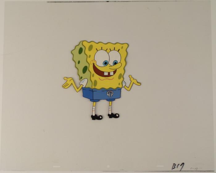 This original animation cel is from the Nickelodeon TV show SpongeBob Squarepants. The story takes place under the deep blue sea in Bikini Bottom, where SpongeBob resides. SpongeBob, who is a yellow, porous sponge, is your typical happy-go-lucky character, as he is always cheerful and enjoys making people laugh. Patrick Star, SpongeBob's Starfish neighbor, boasts knowing nothing and is often getting himself into ridiculous situations. Between the homes of these two lies the home of the miserable Squidward, a squid, who is known for being grouchy and playing tricks on SpongeBob and Patrick. Both SpongeBob and Squidward work at the Krusty Krab, a fast food business run by the greedy money-loving Mr. Krabs, a crab, the arch rival of the evil, possibly misunderstood, Plankton. Another neighbor, Sandy Cheeks, an athletic squirrel who normally wears an astronaut's space suit, was introduced in "Tea at the Treedome." She spends most of her time inventing and experimenting. This cel is larger than average. In it, SpongeBob looks quite delighted. Original Production Animated Cel Overall Size of Cel: 13 1/2" x 16 1/2" Excellent Condition; slight outline wearEach one-of-a-kind set-up represents a slight change in position of the characters. When individually photographed and projected in rapid succession, the images appear to move.