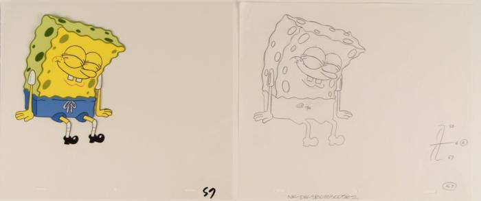 This original animation cel with accompanying drawing is from the Nickelodeon TV show SpongeBob Squarepants. The story takes place under the deep blue sea in Bikini Bottom, where SpongeBob resides. SpongeBob, who is a yellow, porous sponge, is your typical happy-go-lucky character, as he is always cheerful and enjoys making people laugh. Patrick Star, SpongeBob's neighbor who is a starfish, as he boasts knowing nothing and is often getting himself into ridiculous situations. Between the homes of these two lies the home of the miserable Squidward, a squid, who is known for being grouchy and playing tricks on SpongeBob and Patrick. Both SpongeBob and Squidward work at the Krusty Krab, a fast food business run by the greedy money-loving Mr. Krabs, a crab, the arch rival of the evil, possibly misunderstood, Plankton. Another neighbor, Sandy Cheeks, an athletic squirrel who normally wears an astronaut's space suit, was introduced in "Tea at the Treedome." She spends most of her time inventing and experimenting. In this cel and drawing sketch, SpongeBob is laughing, in a scene that included Plankton. Original Production Animated Cel Overall Size of Cel: 10 1/2" x 12 1/2" Excellent Condition; minor outline wearDrawing in graphite and brown pencil, showing some erasures, and animator notations.This is an original hand-painted cel set-up used in the production of an episode of "SpongeBob SquarePants." Each one-of-a-kind set-up represents a slight change in position of the characters. When individually photographed and projected in rapid succession, the images appear to move.
