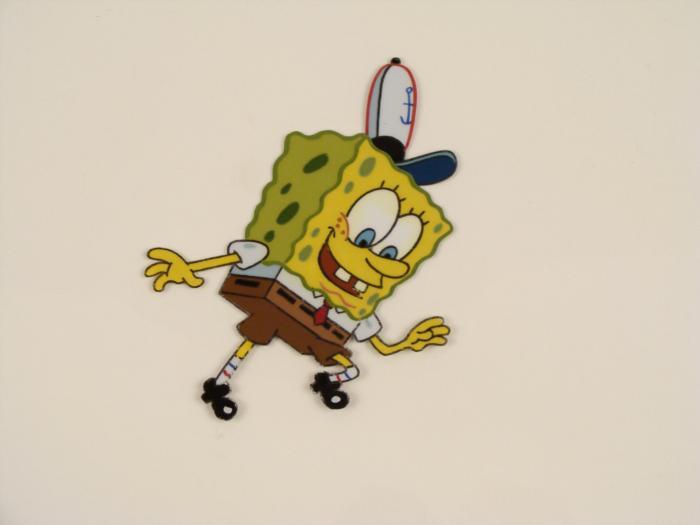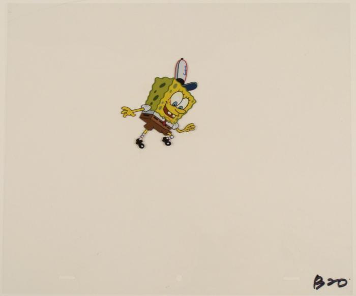 This original animation cel is from the Nickelodeon TV show SpongeBob Squarepants. The story takes place under the deep blue sea in Bikini Bottom, where SpongeBob resides. SpongeBob, who is a yellow, porous sponge, is your typical happy-go-lucky character, as he is always cheerful and enjoys making people laugh. Patrick Star, SpongeBob's neighbor who is a starfish, is your average children's show idiot, as he boasts knowing nothing and is often getting himself into ridiculous situations. Between the homes of these two lies the home of the miserable Squidward, a squid, who is known for being grouchy and playing tricks on SpongeBob and Patrick. Both SpongeBob and Squidward work at the Krusty Krab, a fast food business run by the greedy money-loving Mr. Krabs, a crab, the arch rival of the evil, possibly misunderstood, Plankton. Another neighbor, Sandy Cheeks, an athletic squirrel who normally wears an astronaut's space suit, was introduced in "Tea at the Treedome." She spends most of her time inventing and experimenting. SpongeBob is looking downOriginal Production Animated Cel Overall Size of Cel: 10 1/2" x 12 1/2" Very Good ConditionThis is an original hand-painted cel set-up used in the production of an episode of "SpongeBob SquarePants." Each one-of-a-kind set-up represents a slight change in position of the characters. When individually photographed and projected in rapid succession, the images appear to move.
