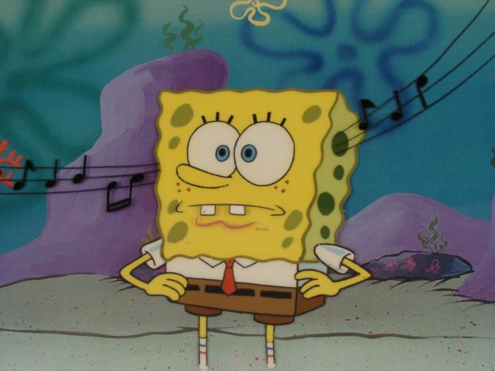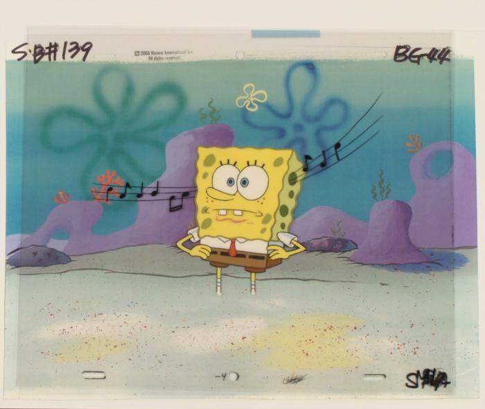 This animation cel and reproduction background are from the Nickelodeon TV show SpongeBob Squarepants. The story takes place under the deep blue sea in Bikini Bottom, where SpongeBob resides. SpongeBob, who is a yellow, porous sponge, is your typical happy-go-lucky character, as he is always cheerful and enjoys making people laugh. Patrick Star, SpongeBob's neighbor who is a starfish, is your average children's show idiot, as he boasts knowing nothing and is often getting himself into ridiculous situations. Between the homes of these two lies the home of the miserable Squidward, a squid, who is known for being grouchy and playing tricks on SpongeBob and Patrick. Both SpongeBob and Squidward work at the Krusty Krab, a fast food business run by the greedy money-loving Mr. Krabs, a crab, the arch rival of the evil, possibly misunderstood, Plankton. Another neighbor, Sandy Cheeks, an athletic squirrel who normally wears an astronaut's space suit, was introduced in "Tea at the Treedome." She spends most of her time inventing and experimenting. SpongeBob is making music.Original Printed Background and Animated Cel Overall Size of Background: 11" x 18" Overall Size of the Cel: 10 1/2" x 12 1/2" Very good condition This is an original hand-painted cel set-up used in the production of an episode of "SpongeBob SquarePants." Each one-of-a-kind set-up represents a slight change in position of the characters. When individually photographed and projected in rapid succession, the images appear to move.