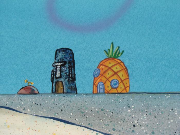 This original hand-painted background is from the Nickelodeon TV show SpongeBob Squarepants. The story takes place under the deep blue sea in Bikini Bottom, where SpongeBob resides. SpongeBob, who is a yellow, porous sponge, is your typical happy-go-lucky character, as he is always cheerful and enjoys making people laugh. Patrick Star, SpongeBob's neighbor, is a starfish who boasts knowing nothing and is often getting himself into ridiculous situations. Between the homes of these two lies the home of the miserable Squidward, a squid, who is known for being grouchy and playing tricks on SpongeBob and Patrick. Both SpongeBob and Squidward work at the Krusty Krab, a fast food business run by the greedy money-loving Mr. Krabs, a crab, the arch rival of the evil, possibly misunderstood, Plankton. Another neighbor, Sandy Cheeks, an athletic squirrel who normally wears an astronaut's space suit, was introduced in "Tea at the Treedome." She spends most of her time inventing and experimenting. In the distance is SpongeBob's neighborhood.Original Production Background Overall Size of Background: 10 1/4" x 13 1/4" Very good conditionOriginal Production Backgrounds are used in the making of the final version of animated productions. The background establishes the location and the overall good mood of the scenee. Typically, a background layout artist creates a drawing to establish the content of the scene, placement of characters, perspective and camera angle. Based on this drawing, the background artist creates a preliminary painting to confirm all of the scenes details, then the final production background which is used in the filming of the scene. When these backgrounds are individually photographed behind the progression of production cels, and projected at a rapid succession, the images in the foreground appear to move, creating an animated scene. The background is ready to be matted and framed. It is a colored background with the animator's notations at the bottom.