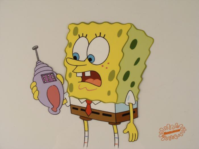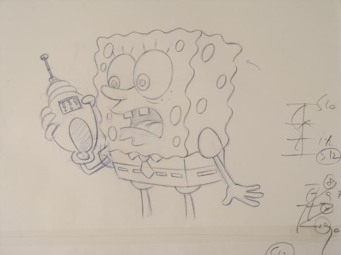 This original animation cel with accompanying drawing is from the Nickelodeon TV show SpongeBob Squarepants. The story takes place under the deep blue sea in Bikini Bottom, where SpongeBob resides. SpongeBob, who is a yellow, porous sponge, is your typical happy-go-lucky character, as he is always cheerful and enjoys making people laugh. Patrick Star, SpongeBob's neighbor who is a starfish, as he boasts knowing nothing and is often getting himself into ridiculous situations. Between the homes of these two lies the home of the miserable Squidward, a squid, who is known for being grouchy and playing tricks on SpongeBob and Patrick. Both SpongeBob and Squidward work at the Krusty Krab, a fast food business run by the greedy money-loving Mr. Krabs, a crab, the arch rival of the evil, possibly misunderstood, Plankton. Another neighbor, Sandy Cheeks, an athletic squirrel who normally wears an astronaut's space suit, was introduced in "Tea at the Treedome." She spends most of her time inventing and experimenting. In this cel and drawing sketch, SpongeBob is on the phone, looking a bit worried. Original Production Animated Cel Overall Size of Cel: 10 1/2" x 12 1/2" Excellent Condition; minor outline wear Drawing in graphite and non-photo blue pencil, showing animator notations.This is an original hand-painted cel set-up used in the production of an episode of "SpongeBob SquarePants." Each one-of-a-kind set-up represents a slight change in position of the characters. When individually photographed and projected in rapid succession, the images appear to move.