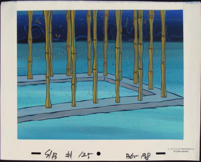 This original hand-painted background is from the Nickelodeon television show SpongeBob Squarepants. The story takes place under the deep blue sea in Bikini Bottom, where SpongeBob resides. SpongeBob, who is a yellow, porous sponge, is your typical happy-go-lucky character, as he is always cheerful and enjoys making people laugh. His best friend and neighbor is Patrick Star, a starfish who boasts knowing nothing and is often getting himself into ridiculous situations. Between the homes of these two lies the home of the miserable Squidward, a squid, who is known for being grouchy and playing tricks on SpongeBob and Patrick. Both SpongeBob and Squidward work at the Krusty Krab, a fast food business run by the greedy money-loving Mr. Krabs, a crab, the arch rival of the evil, possibly misunderstood, Plankton. Another neighbor, Sandy Cheeks, an athletic squirrel who normally wears an astronaut's space suit, was introduced in "Tea at the Treedome." She spends most of her time inventing and experimenting. This background of a cage on the ocean floor--watch out SpongeBob!Original Production Background on paper, with peg holes Size of sheet: 10 1/8 x 12 3/4 inchesVery good condition, with slight wear and smudging in the margins; has been stored rolledOriginal Production Backgrounds are used in the making of the final version of animated productions. The background establishes the location and the overall good mood of the scene. Typically, a background layout artist creates a drawing to establish the content of the scene, placement of characters, perspective and camera angle. Based on this drawing, the background artist creates a preliminary painting to confirm all of the scenes details, then the final production background which is used in the filming of the scene. When these backgrounds are individually photographed behind the progression of production cels, and projected at a rapid succession, the images in the foreground appear to move, creating an animated scene. The background is ready to be matted and framed. It includes animator's notations at the lower edge, and a 2003 Viacom stamp.