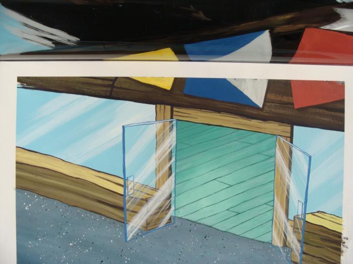 This original hand-painted background with cel is from the Nickelodeon television show SpongeBob Squarepants. The story takes place under the deep blue sea in Bikini Bottom, where SpongeBob resides. SpongeBob, who is a yellow, porous sponge, is your typical happy-go-lucky character, as he is always cheerful and enjoys making people laugh. His best friend and neighbor is Patrick Star, a starfish who boasts knowing nothing and is often getting himself into ridiculous situations. Between the homes of these two lies the home of the miserable Squidward, a squid, who is known for being grouchy and playing tricks on SpongeBob and Patrick. Both SpongeBob and Squidward work at the Krusty Krab, a fast food business run by the greedy money-loving Mr. Krabs, a crab, the arch rival of the evil, possibly misunderstood, Plankton. Another neighbor, Sandy Cheeks, an athletic squirrel who normally wears an astronaut's space suit, was introduced in "Tea at the Treedome." She spends most of her time inventing and experimenting. This background is An overhead view of the entryway to the Krusty Krab.Original Production Background on paper, with peg holes; 1 cel overlay Size of background sheet: 10 1/4 x 14 inchesVery good condition; has been stored rolledOriginal Production Backgrounds are used in the making of the final version of animated productions. The background establishes the location and the overall good mood of the scene. Typically, a background layout artist creates a drawing to establish the content of the scene, placement of characters, perspective and camera angle. Based on this drawing, the background artist creates a preliminary painting to confirm all of the scenes details, then the final production background which is used in the filming of the scene. When these backgrounds are individually photographed behind the progression of production cels, and projected at a rapid succession, the images in the foreground appear to move, creating an animated scene. The background is ready to be matted and framed. It includes animator's notations at the lower edge, and a 2003 Viacom stamp. The cel overlay is hand-painted, and it includes the ground and the building.