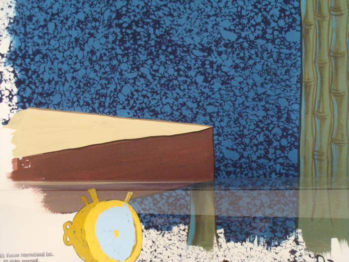This is an original hand-painted background and cel from the Nickelodeon television show SpongeBob Squarepants. The story takes place under the deep blue sea in Bikini Bottom, where SpongeBob resides. SpongeBob, who is a yellow, porous sponge, is your typical happy-go-lucky character, as he is always cheerful and enjoys making people laugh. His best friend and neighbor is Patrick Star, a starfish who boasts knowing nothing and is often getting himself into ridiculous situations. Between the homes of these two lies the home of the miserable Squidward, a squid, who is known for being grouchy and playing tricks on SpongeBob and Patrick. Both SpongeBob and Squidward work at the Krusty Krab, a fast food business run by the greedy money-loving Mr. Krabs, a crab, the arch rival of the evil, possibly misunderstood, Plankton. Another neighbor, Sandy Cheeks, an athletic squirrel who normally wears an astronaut's space suit, was introduced in "Tea at the Treedome." She spends most of her time inventing and experimenting. This background shows Squidward's alarm clock on the nightstand from the point of view of his bed.Original Production Background on paper, with peg holes; the clock is painted on the cel overlay Size of sheet: 10 1/4 x 12 1/4 inchesVery good condition, with slight margin wear; has been stored rolledOriginal Production Backgrounds are used in the making of the final version of animated productions. The background establishes the location and the overall good mood of the scene. Typically, a background layout artist creates a drawing to establish the content of the scene, placement of characters, perspective and camera angle. Based on this drawing, the background artist creates a preliminary painting to confirm all of the scenes details, then the final production background which is used in the filming of the scene. When these backgrounds are individually photographed behind the progression of production cels, and projected at a rapid succession, the images in the foreground appear to move, creating an animated scene. The background is ready to be matted and framed. It includes animator's notations at the lower edge.