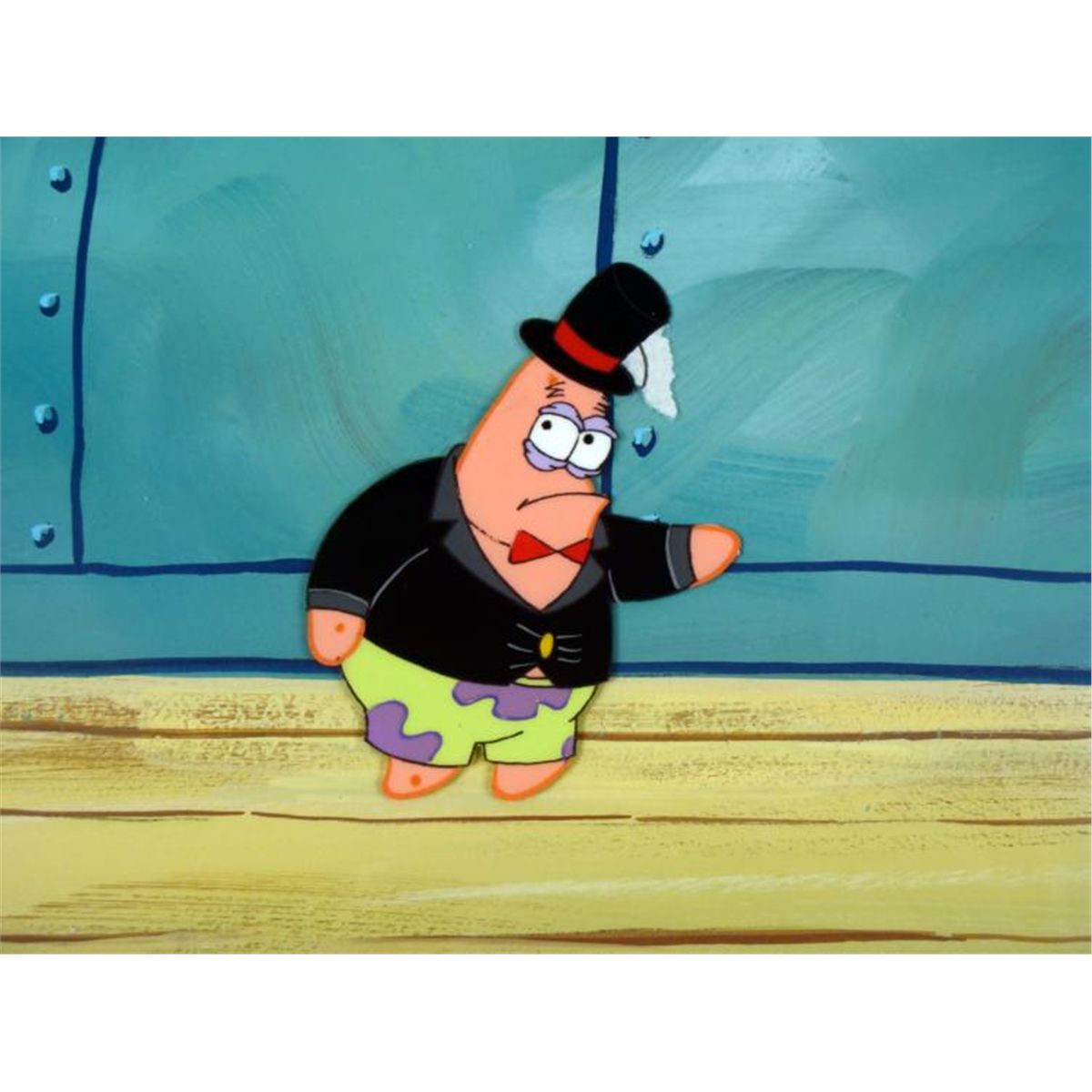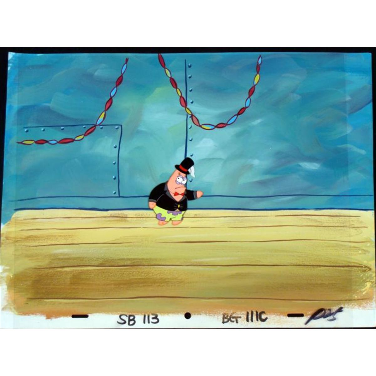 Normal 0 false false false MicrosoftInternetExplorer4 /* Style Definitions */ table.MsoNormalTable{mso-style-name:"Table Normal";mso-tstyle-rowband-size:0;mso-tstyle-colband-size:0;mso-style-noshow:yes;mso-style-parent:"";mso-padding-alt:0in 5.4pt 0in 5.4pt;mso-para-margin:0in;mso-para-margin-bottom:.0001pt;mso-pagination:widow-orphan;font-size:10.0pt;font-family:"Times New Roman";mso-ansi-language:#0400;mso-fareast-language:#0400;mso-bidi-language:#0400;}This original hand-painted cel and background is from the Nickelodeon TVs how SpongeBob Squarepants. The story takes place under the deep blue sea in Bikini Bottom, where SpongeBob resides. SpongeBob, who is a yellow, porous sponge, is your typical happy-go-lucky character, as he is always cheerful and enjoys making people laugh. Patrick Star, SpongeBob's neighbor who is a starfish, boasts knowing nothing and is often getting himself into ridiculous situations. Between the homes of these two lies the home of the miserable Squidward, a squid, who is known for being grouchy and playing tricks on SpongeBob and Patrick. Both SpongeBob and Squidward work at the Krusty Krab, a fast food business run by the greedy money-loving Mr. Krabs, a crab, the arch rival of the evil, possibly misunderstood, Plankton. Another neighbor, Sandy Cheeks, an athletic squirrel who normally wears an astronaut's space suit, was introduced in "Tea at the Treedome." She spends most of her time inventing and experimenting. * Patrick sure looks tired- must have been a good party! * * Overall Size of Background: 10 1/2" x 14" Overall size of cel: 10 1/2" x 12 1/2"Very good conditionOriginal Production Backgrounds are used in the making of the final version of animated productions. The background establishes the location and the overall good mood of the scene. Typically, a background layout artist creates a drawing to establish the content of the scene, placement of characters, perspective and camera angle. Based on this drawing, the background artist creates a preliminary painting to confirm all of the scenes details, then the final production background which is used in the filming of the scene. When these backgrounds are individually photographed behind the progression of production cels, and projected at a rapid succession, the images in the foreground appear to move, creating an animated scene. * This cel was placed with this background because it appears to go well with it. The bottom of the sheet has peg holes, and the animator's notations. *