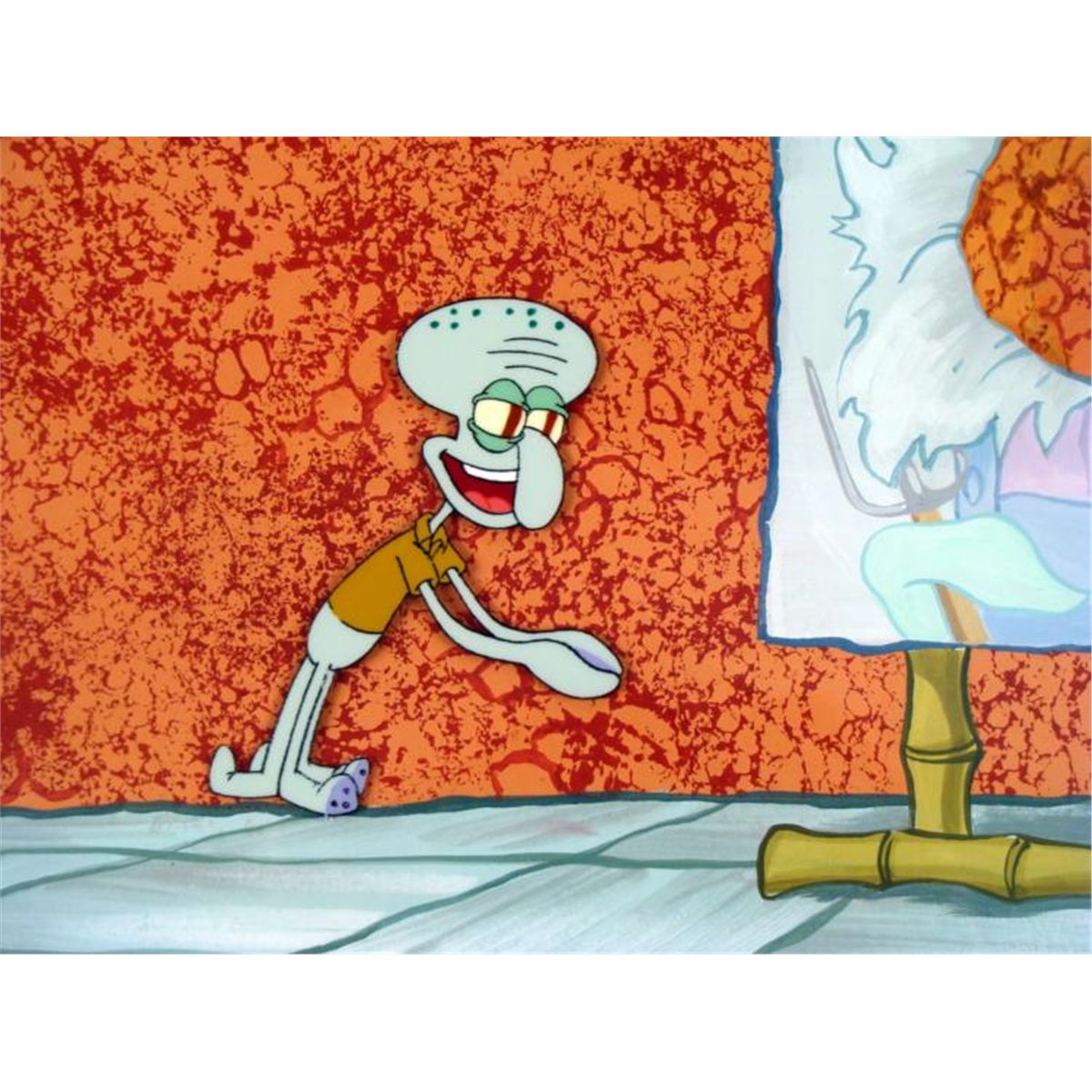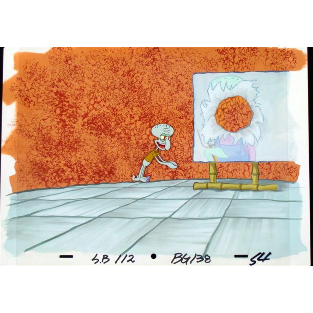 Normal 0 false false false MicrosoftInternetExplorer4 /* Style Definitions */ table.MsoNormalTable{mso-style-name:"Table Normal";mso-tstyle-rowband-size:0;mso-tstyle-colband-size:0;mso-style-noshow:yes;mso-style-parent:"";mso-padding-alt:0in 5.4pt 0in 5.4pt;mso-para-margin:0in;mso-para-margin-bottom:.0001pt;mso-pagination:widow-orphan;font-size:10.0pt;font-family:"Times New Roman";mso-ansi-language:#0400;mso-fareast-language:#0400;mso-bidi-language:#0400;}This original hand-painted cel and background is from the Nickelodeon TVs how SpongeBob Squarepants. The story takes place under the deep blue sea in Bikini Bottom, where SpongeBob resides. SpongeBob, who is a yellow, porous sponge, is your typical happy-go-lucky character, as he is always cheerful and enjoys making people laugh. Patrick Star, SpongeBob's neighbor who is a starfish, boasts knowing nothing and is often getting himself into ridiculous situations. Between the homes of these two lies the home of the miserable Squidward, a squid, who is known for being grouchy and playing tricks on SpongeBob and Patrick. Both SpongeBob and Squidward work at the Krusty Krab, a fast food business run by the greedy money-loving Mr. Krabs, a crab, the arch rival of the evil, possibly misunderstood, Plankton. Another neighbor, Sandy Cheeks, an athletic squirrel who normally wears an astronaut's space suit, was introduced in "Tea at the Treedome." She spends most of her time inventing and experimenting. * Squidward may not have noticed yet, but his painting has a big hole in it. * * Original Production Background Overall Size of Background: 10 1/2" x 14" Overall size of cel: 10 1/2" x 12 1/2"Very good conditionOriginal Production Backgrounds are used in the making of the final version of animated productions. The background establishes the location and the overall good mood of the scene. Typically, a background layout artist creates a drawing to establish the content of the scene, placement of characters, perspective and camera angle. Based on this drawing, the background artist creates a preliminary painting to confirm all of the scenes details, then the final production background which is used in the filming of the scene. When these backgrounds are individually photographed behind the progression of production cels, and projected at a rapid succession, the images in the foreground appear to move, creating an animated scene. * This cel was placed with this background because it appears to go well with it. The bottom of the sheet has peg holes, and the animator's notations. *