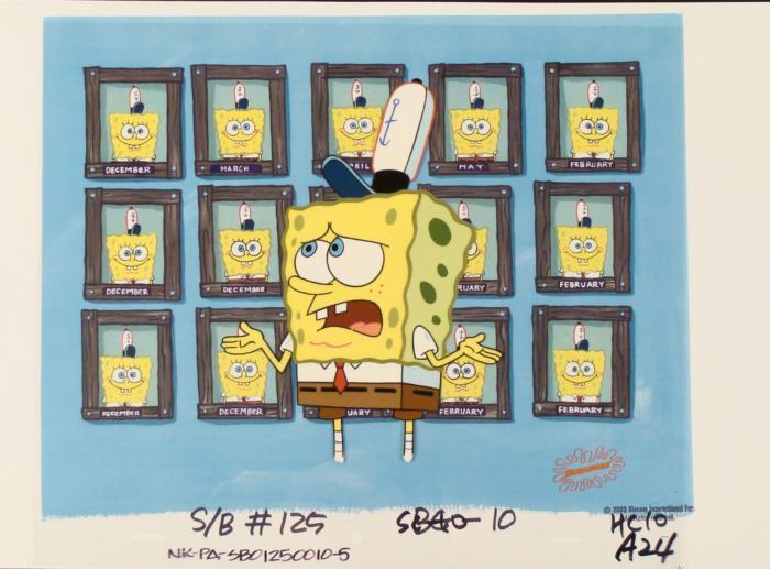 This animation cel and reproduction background are from the Nickelodeon TV show SpongeBob Squarepants. The story takes place under the deep blue sea in Bikini Bottom, where SpongeBob resides. SpongeBob, who is a yellow, porous sponge, is your typical happy-go-lucky character, as he is always cheerful and enjoys making people laugh. Patrick Star, SpongeBob's neighbor who is a starfish, is your average children's show idiot, as he boasts knowing nothing and is often getting himself into ridiculous situations. Between the homes of these two lies the home of the miserable Squidward, a squid, who is known for being grouchy and playing tricks on SpongeBob and Patrick. Both SpongeBob and Squidward work at the Krusty Krab, a fast food business run by the greedy money-loving Mr. Krabs, a crab, the arch rival of the evil, possibly misunderstood, Plankton. Another neighbor, Sandy Cheeks, an athletic squirrel who normally wears an astronaut's space suit, was introduced in "Tea at the Treedome." She spends most of her time inventing and experimenting. SpongeBob has been Employee of the Month a lot.Original Printed Background and Animated Cel Overall Size of Background: 10 1/2" x 17" Overall Size of the Cel: 10 1/2" x 12 1/2" Very good condition This is an original hand-painted cel set-up used in the production of an episode of "SpongeBob SquarePants." Each one-of-a-kind set-up represents a slight change in position of the characters. When individually photographed and projected in rapid succession, the images appear to move.