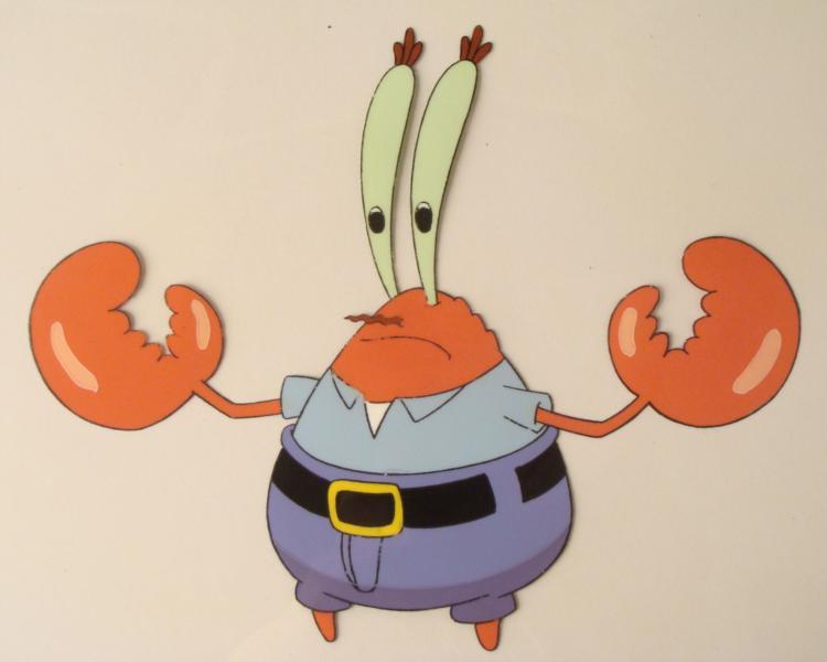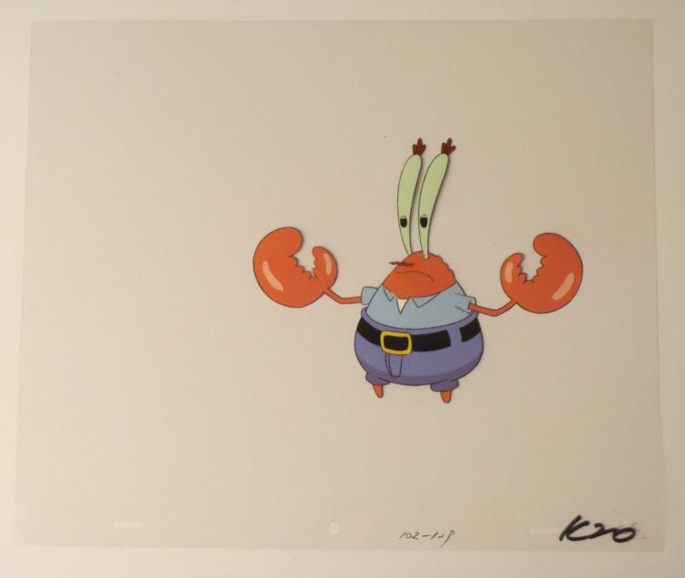 This original animation cel is from the Nickelodeon TV show SpongeBob Squarepants. The story takes place under the deep blue sea in Bikini Bottom, where SpongeBob resides. SpongeBob, who is a yellow, porous sponge, is your typical happy-go-lucky character, as he is always cheerful and enjoys making people laugh. Patrick Star, SpongeBob's neighbor who is a starfish, is your average children's show idiot, as he boasts knowing nothing and is often getting himself into ridiculous situations. Between the homes of these two lies the home of the miserable Squidward, a squid, who is known for being grouchy and playing tricks on SpongeBob and Patrick. Both SpongeBob and Squidward work at the Krusty Krab, a fast food business run by the greedy money-loving Mr. Krabs, a crab, the arch rival of the evil, possibly misunderstood, Plankton. Another neighbor, Sandy Cheeks, an athletic squirrel who normally wears an astronaut's space suit, was introduced in "Tea at the Treedome." She spends most of her time inventing and experimenting. * "What's up?" * Original Production Animated Cel Overall Size of Cel: 10 1/2" x 12 1/2" Very Good Condition This is an original hand-painted cel set-up used in the production of an episode of "SpongeBob SquarePants." Each one-of-a-kind set-up represents a slight change in position of the characters. When individually photographed and projected in rapid succession, the images appear to move. * To create production cels, the original animator's drawing is transferred onto an acetate cel (by hand-inking and/or photo copying). The cel is then hand-painted on the reverse side. * The cel received by the winning bidder may be ever so slightly different from the one in the auction photos. * The cel is ready to be matted and framed. The animator's notations are at the bottom of the cel. *