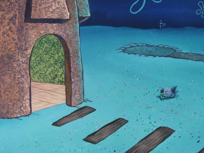 This original hand-painted background from the Nickelodeon TV show SpongeBob Squarepants. The story takes place under the deep blue sea in Bikini Bottom, where SpongeBob resides. SpongeBob, who is a yellow, porous sponge, is your typical happy-go-lucky character, as he is always cheerful and enjoys making people laugh. Patrick Star, SpongeBob's neighbor who is a starfish, is your average children's show idiot, as he boasts knowing nothing and is often getting himself into ridiculous situations. Between the homes of these two lies the home of the miserable Squidward, a squid, who is known for being grouchy and playing tricks on SpongeBob and Patrick. Both SpongeBob and Squidward work at the Krusty Krab, a fast food business run by the greedy money-loving Mr. Krabs, a crab, the arch rival of the evil, possibly misunderstood, Plankton. Another neighbor, Sandy Cheeks, an athletic squirrel who normally wears an astronaut's space suit, was introduced in "Tea at the Treedome." She spends most of her time inventing and experimenting. What happened to SpongeBob's house?Original Production Background Overall Size of Background: 10 1/4" x 13 1/2" Very good condition; it has been storedOriginal Production Backgrounds are used in the making of the final version of animated productions. The background establishes the location and the overall good mood of the scenee. Typically, a background layout artist creates a drawing to establish the content of the scene, placement of characters, perspective and camera angle. Based on this drawing, the background artist creates a preliminary painting to confirm all of the scenes details, then the final production background which is used in the filming of the scene. When these backgrounds are individually photographed behind the progression of production cels, and projected at a rapid succession, the images in the foreground appear to move, creating an animated scene. The background is ready to be matted and framed. It is a colored background with the animator's notations at the bottom. The notations have been taped to the bottom of the background.