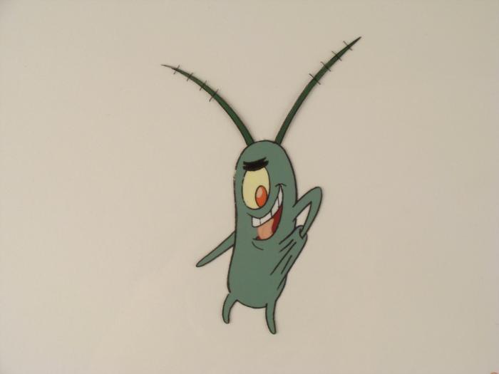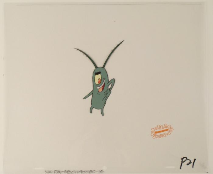 This original animation cel is from the Nickelodeon TV show SpongeBob Squarepants. The story takes place under the deep blue sea in Bikini Bottom, where SpongeBob resides. SpongeBob, who is a yellow, porous sponge, is your typical happy-go-lucky character, as he is always cheerful and enjoys making people laugh. Patrick Star, SpongeBob's neighbor who is a starfish, is your average children's show idiot, as he boasts knowing nothing and is often getting himself into ridiculous situations. Between the homes of these two lies the home of the miserable Squidward, a squid, who is known for being grouchy and playing tricks on SpongeBob and Patrick. Both SpongeBob and Squidward work at the Krusty Krab, a fast food business run by the greedy money-loving Mr. Krabs, a crab, the arch rival of the evil, possibly misunderstood, Plankton. Another neighbor, Sandy Cheeks, an athletic squirrel who normally wears an astronaut's space suit, was introduced in "Tea at the Treedome." She spends most of her time inventing and experimenting. What is in Plankton's pocket?Original Production Animated Cel Overall Size of Cel: 10 1/2" x 12 1/2" Very Good ConditionThis is an original hand-painted cel set-up used in the production of an episode of "SpongeBob SquarePants." Each one-of-a-kind set-up represents a slight change in position of the characters. When individually photographed and projected in rapid succession, the images appear to move.