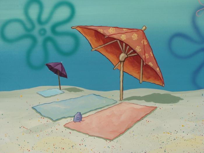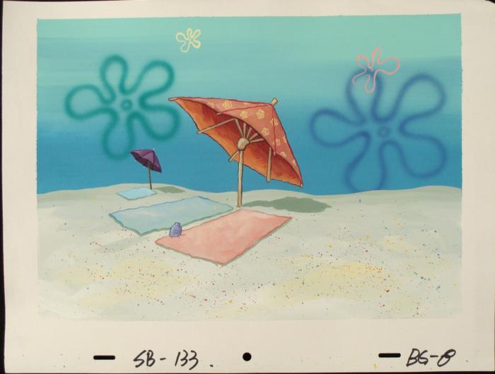 This original hand-painted background from the Nickelodeon TV show SpongeBob Squarepants. The story takes place under the deep blue sea in Bikini Bottom, where SpongeBob resides. SpongeBob, who is a yellow, porous sponge, is your typical happy-go-lucky character, as he is always cheerful and enjoys making people laugh. Patrick Star, SpongeBob's neighbor who is a starfish, is your average children's show idiot, as he boasts knowing nothing and is often getting himself into ridiculous situations. Between the homes of these two lies the home of the miserable Squidward, a squid, who is known for being grouchy and playing tricks on SpongeBob and Patrick. Both SpongeBob and Squidward work at the Krusty Krab, a fast food business run by the greedy money-loving Mr. Krabs, a crab, the arch rival of the evil, possibly misunderstood, Plankton. Another neighbor, Sandy Cheeks, an athletic squirrel who normally wears an astronaut's space suit, was introduced in "Tea at the Treedome." She spends most of her time inventing and experimenting. There are towels at the beach.Original Production Background Overall Size of Background: 10 1/2" x 13 3/4" Very good conditionOriginal Production Backgrounds are used in the making of the final version of animated productions. The background establishes the location and the overall good mood of the scenee. Typically, a background layout artist creates a drawing to establish the content of the scene, placement of characters, perspective and camera angle. Based on this drawing, the background artist creates a preliminary painting to confirm all of the scenes details, then the final production background which is used in the filming of the scene. When these backgrounds are individually photographed behind the progression of production cels, and projected at a rapid succession, the images in the foreground appear to move, creating an animated scene. The background is ready to be matted and framed. It is a colored background with the animator's notations at the bottom.