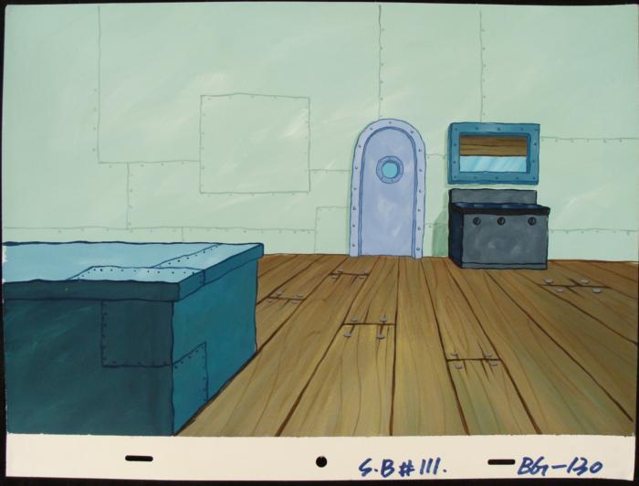 This original hand-painted background from the Nickelodeon TV show SpongeBob Squarepants. The story takes place under the deep blue sea in Bikini Bottom, where SpongeBob resides. SpongeBob, who is a yellow, porous sponge, is your typical happy-go-lucky character, as he is always cheerful and enjoys making people laugh. Patrick Star, SpongeBob's neighbor who is a starfish, is your average children's show idiot, as he boasts knowing nothing and is often getting himself into ridiculous situations. Between the homes of these two lies the home of the miserable Squidward, a squid, who is known for being grouchy and playing tricks on SpongeBob and Patrick. Both SpongeBob and Squidward work at the Krusty Krab, a fast food business run by the greedy money-loving Mr. Krabs, a crab, the arch rival of the evil, possibly misunderstood, Plankton. Another neighbor, Sandy Cheeks, an athletic squirrel who normally wears an astronaut's space suit, was introduced in "Tea at the Treedome." She spends most of her time inventing and experimenting. This is inside the Krusty Krab resturant.Original Production Background Overall Size of Background: 10 1/2" x 14" Very good conditionOriginal Production Backgrounds are used in the making of the final version of animated productions. The background establishes the location and the overall good mood of the scenee. Typically, a background layout artist creates a drawing to establish the content of the scene, placement of characters, perspective and camera angle. Based on this drawing, the background artist creates a preliminary painting to confirm all of the scenes details, then the final production background which is used in the filming of the scene. When these backgrounds are individually photographed behind the progression of production cels, and projected at a rapid succession, the images in the foreground appear to move, creating an animated scene. The background is ready to be matted and framed. It is a colored background with the animator's notations at the bottom.