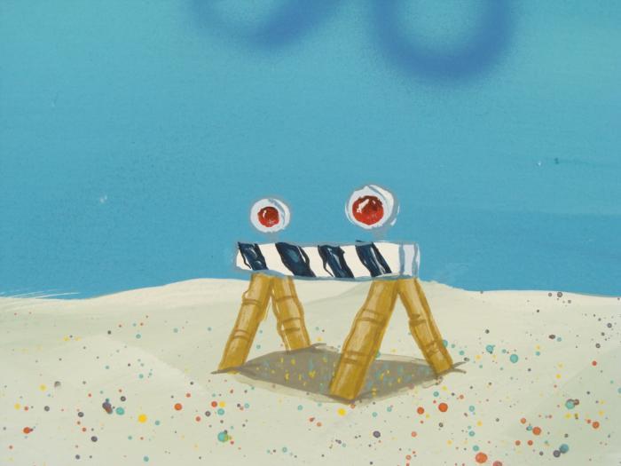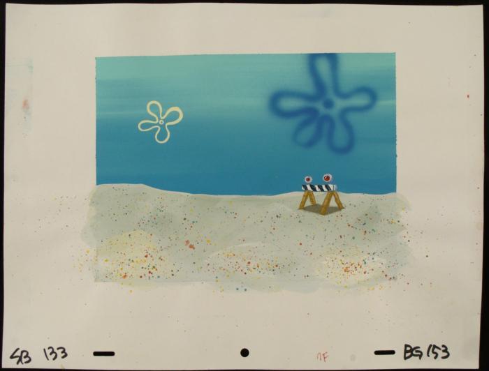 This original hand-painted background from the Nickelodeon TV show SpongeBob Squarepants. The story takes place under the deep blue sea in Bikini Bottom, where SpongeBob resides. SpongeBob, who is a yellow, porous sponge, is your typical happy-go-lucky character, as he is always cheerful and enjoys making people laugh. Patrick Star, SpongeBob's neighbor who is a starfish, is your average children's show idiot, as he boasts knowing nothing and is often getting himself into ridiculous situations. Between the homes of these two lies the home of the miserable Squidward, a squid, who is known for being grouchy and playing tricks on SpongeBob and Patrick. Both SpongeBob and Squidward work at the Krusty Krab, a fast food business run by the greedy money-loving Mr. Krabs, a crab, the arch rival of the evil, possibly misunderstood, Plankton. Another neighbor, Sandy Cheeks, an athletic squirrel who normally wears an astronaut's space suit, was introduced in "Tea at the Treedome." She spends most of her time inventing and experimenting. What is on the beach?Original Production Background Overall Size of Background: 10 1/2" x 13 1/2" Very good conditionOriginal Production Backgrounds are used in the making of the final version of animated productions. The background establishes the location and the overall good mood of the scenee. Typically, a background layout artist creates a drawing to establish the content of the scene, placement of characters, perspective and camera angle. Based on this drawing, the background artist creates a preliminary painting to confirm all of the scenes details, then the final production background which is used in the filming of the scene. When these backgrounds are individually photographed behind the progression of production cels, and projected at a rapid succession, the images in the foreground appear to move, creating an animated scene. The background is ready to be matted and framed. It is a colored background with the animator's notations at the bottom.