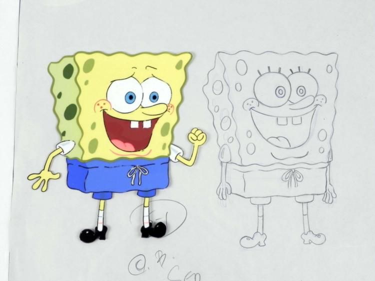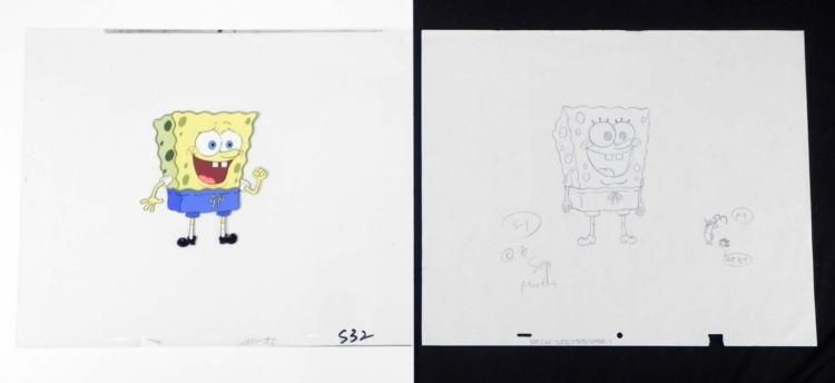 This is an original large hand-painted animation cel with matching drawing from the Nickelodeon TV show SpongeBob Squarepants. The story takes place under the deep blue sea in Bikini Bottom, where SpongeBob resides. SpongeBob, who is a yellow, porous sponge, is your typical happy-go-lucky character, as he is always cheerful and enjoys making people laugh. Patrick Star, SpongeBob's neighbor who is a starfish, boasts knowing nothing and is often getting himself into ridiculous situations. Between the homes of these two lies the home of the miserable Squidward, a squid, who is known for being grouchy and playing tricks on SpongeBob and Patrick. Both SpongeBob and Squidward work at the Krusty Krab, a fast food business run by the greedy money-loving Mr. Krabs, a crab, the arch rival of the evil, possibly misunderstood, Plankton. Another neighbor, Sandy Cheeks, an athletic squirrel who normally wears an astronaut's space suit, was introduced in "Tea at the Treedome." She spends most of her time inventing and experimenting. * SpongeBob is quite happy here. Note, the drawing also shows Plankton, who stepped into the scene. * * Overall Size of cel and drawing: 13 1/2" x 16 1/2" Very good conditionEach one-of-a-kind set-up represents a slight change in position of the characters. When individually photographed and projected in rapid succession, the images appear to move. * To create production cels, the original animator's drawing is transferred onto an acetate cel (by hand-inking and/or photo copying). The cel is then hand-painted on the reverse side. * This is a double layer cel, with SpongeBob on one sheet, and his mouth on the other. The drawing is done with black and blue pencil. The bottom of the sheets have peg holes, and the animator's notations. *