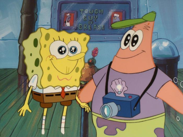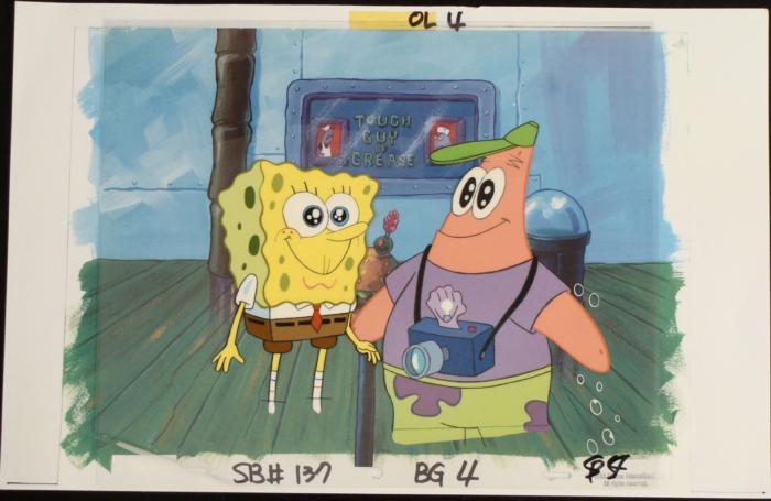 This animation cel and reproduction background are from the Nickelodeon TV show SpongeBob Squarepants. The story takes place under the deep blue sea in Bikini Bottom, where SpongeBob resides. SpongeBob, who is a yellow, porous sponge, is your typical happy-go-lucky character, as he is always cheerful and enjoys making people laugh. Patrick Star, SpongeBob's neighbor who is a starfish, is your average children's show idiot, as he boasts knowing nothing and is often getting himself into ridiculous situations. Between the homes of these two lies the home of the miserable Squidward, a squid, who is known for being grouchy and playing tricks on SpongeBob and Patrick. Both SpongeBob and Squidward work at the Krusty Krab, a fast food business run by the greedy money-loving Mr. Krabs, a crab, the arch rival of the evil, possibly misunderstood, Plankton. Another neighbor, Sandy Cheeks, an athletic squirrel who normally wears an astronaut's space suit, was introduced in "Tea at the Treedome." She spends most of her time inventing and experimenting. SpongeBob and Patrick are amazedOriginal Printed Background and Animated Cel Overall Size of Printed Background: 11" x 17" Overall Size of the Cel: 10 1/2" x 12 1/2" Very good condition This is an original hand-painted cel set-up used in the production of an episode of "SpongeBob SquarePants." Each one-of-a-kind set-up represents a slight change in position of the characters. When individually photographed and projected in rapid succession, the images appear to move.