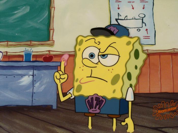 This animation cel and reproduction background are from the Nickelodeon TV show SpongeBob Squarepants. The story takes place under the deep blue sea in Bikini Bottom, where SpongeBob resides. SpongeBob, who is a yellow, porous sponge, is your typical happy-go-lucky character, as he is always cheerful and enjoys making people laugh. Patrick Star, SpongeBob's neighbor who is a starfish, is your average children's show idiot, as he boasts knowing nothing and is often getting himself into ridiculous situations. Between the homes of these two lies the home of the miserable Squidward, a squid, who is known for being grouchy and playing tricks on SpongeBob and Patrick. Both SpongeBob and Squidward work at the Krusty Krab, a fast food business run by the greedy money-loving Mr. Krabs, a crab, the arch rival of the evil, possibly misunderstood, Plankton. Another neighbor, Sandy Cheeks, an athletic squirrel who normally wears an astronaut's space suit, was introduced in "Tea at the Treedome." She spends most of her time inventing and experimenting. SpongeBob has found a clue.Original Printed Background and Animated Cel Overall Size of Background: 10 1/2" x 17" Overall Size of the Cel: 10 1/2" x 12 1/2" Very good condition This is an original hand-painted cel set-up used in the production of an episode of "SpongeBob SquarePants." Each one-of-a-kind set-up represents a slight change in position of the characters. When individually photographed and projected in rapid succession, the images appear to move.