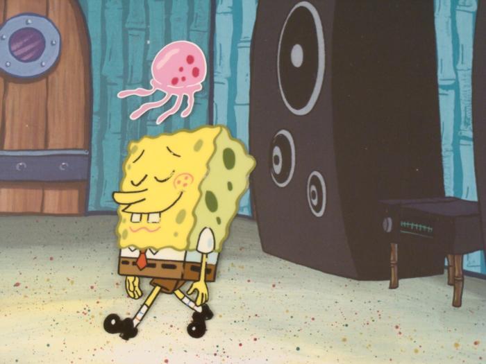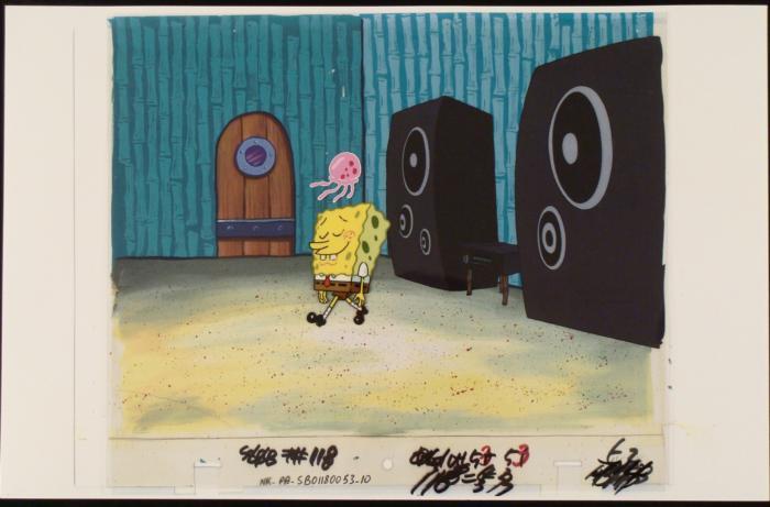 To create production cels, the original animator's drawing is transferred onto an acetate cel (by hand-inking and/or photo copying). The cel is then hand-painted on the reverse side. The printed background is ready to be matted and framed. It is a colored background with a cel and has the animator's notations at the bottom of the background and the cel. The background is a printed reproduction background. There is some slight paint fade to SpongeBob's outline. The cel has multiple layers; first is the jellyfish and the second cel is SpongeBob.