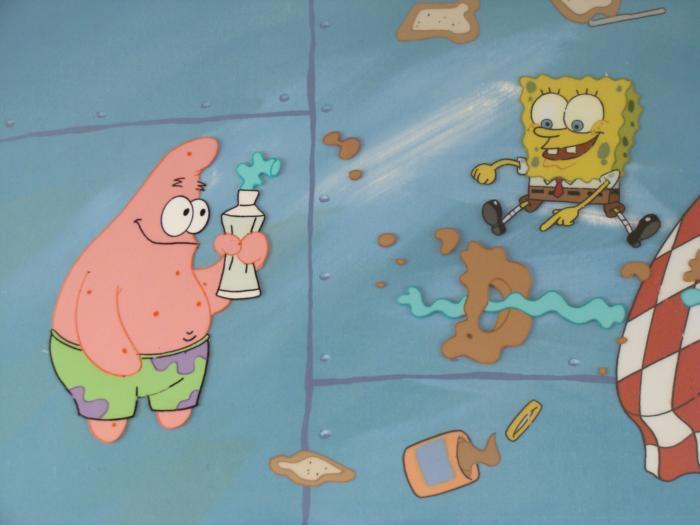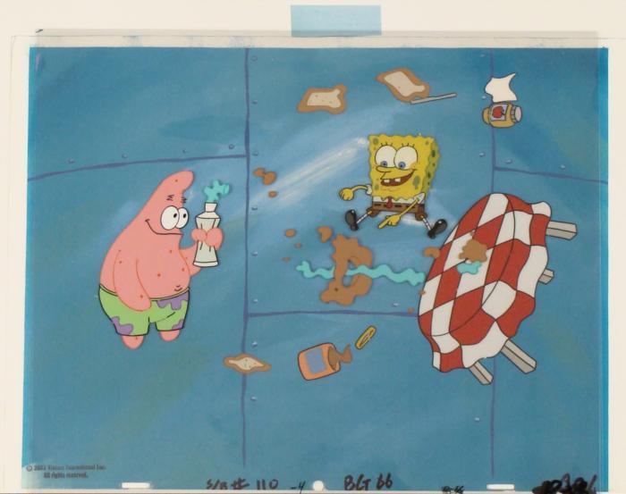 To create production cels, the original animator's drawing is transferred onto an acetate cel (by hand-inking and/or photo copying). The cel is then hand-painted on the reverse side. The printed background is ready to be matted and framed. It is a colored background with a cel and has the animator's notations at the bottom of the background and the cel. The background is a printed reproduction background. The cel has multiple layers; first is Patrick, then the second cel is peanut butter/toothpaste, the third cel is SpongeBob, and finally the last cel is the table. There is some slight paint fade to SpongeBob's outline.