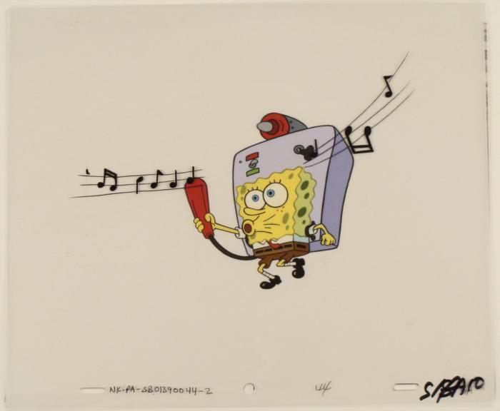 To create production cels, the original animator's drawing is transferred onto an acetate cel (by hand-inking and/or photo copying). The cel is then hand-painted on the reverse side. The cel is ready to be matted and framed. The animator's notations are at the bottom of the cel. There is some slight paint fade to Spongebob's outline. The cel has mutiple layers; first is the music notes and the second cel is SpongeBob with the reef blower.