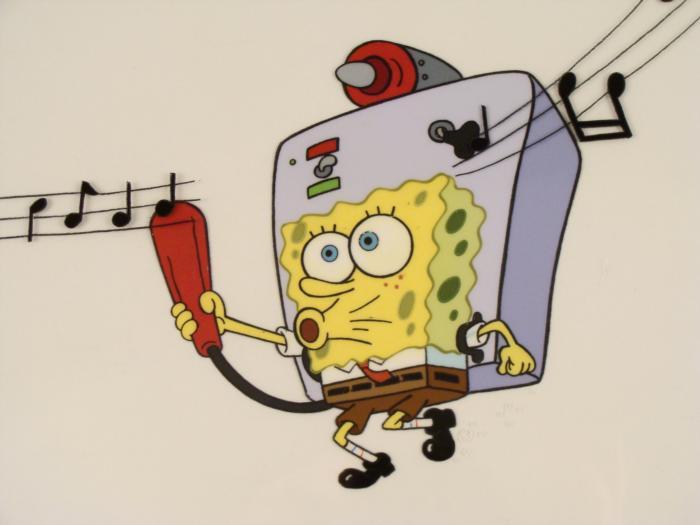 This original animation cel is from the Nickelodeon TV show SpongeBob Squarepants. The story takes place under the deep blue sea in Bikini Bottom, where SpongeBob resides. SpongeBob, who is a yellow, porous sponge, is your typical happy-go-lucky character, as he is always cheerful and enjoys making people laugh. Patrick Star, SpongeBob's neighbor who is a starfish, is your average children's show idiot, as he boasts knowing nothing and is often getting himself into ridiculous situations. Between the homes of these two lies the home of the miserable Squidward, a squid, who is known for being grouchy and playing tricks on SpongeBob and Patrick. Both SpongeBob and Squidward work at the Krusty Krab, a fast food business run by the greedy money-loving Mr. Krabs, a crab, the arch rival of the evil, possibly misunderstood, Plankton. Another neighbor, Sandy Cheeks, an athletic squirrel who normally wears an astronaut's space suit, was introduced in "Tea at the Treedome." She spends most of her time inventing and experimenting. Is the reef blower making music?Original Production Animated Cel Overall Size of Cel: 10 1/2" x 12 1/2" Very Good ConditionThis is an original hand-painted cel set-up used in the production of an episode of "SpongeBob SquarePants." Each one-of-a-kind set-up represents a slight change in position of the characters. When individually photographed and projected in rapid succession, the images appear to move.